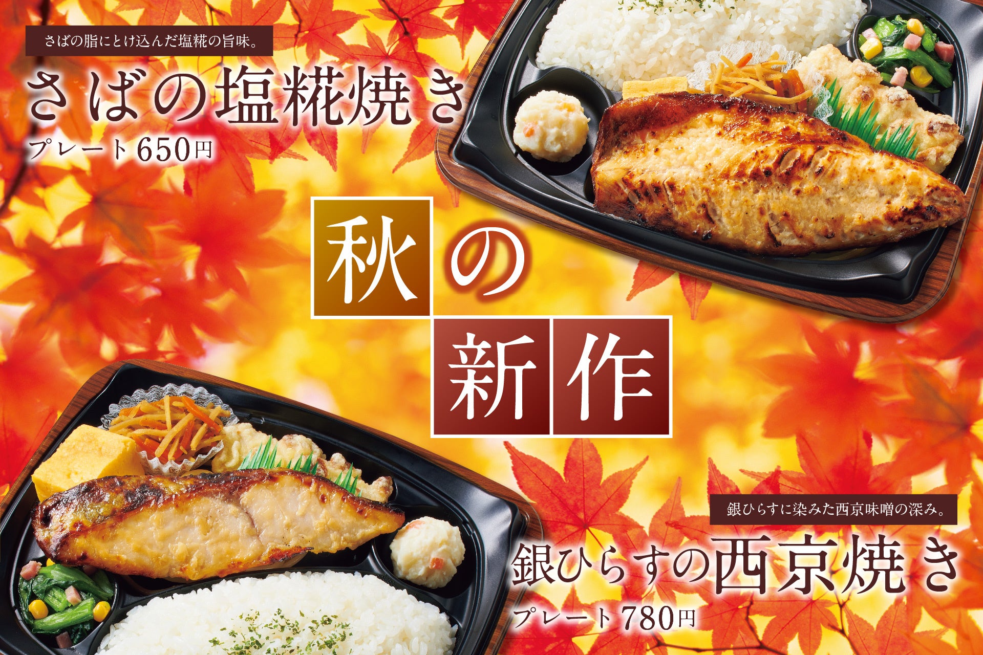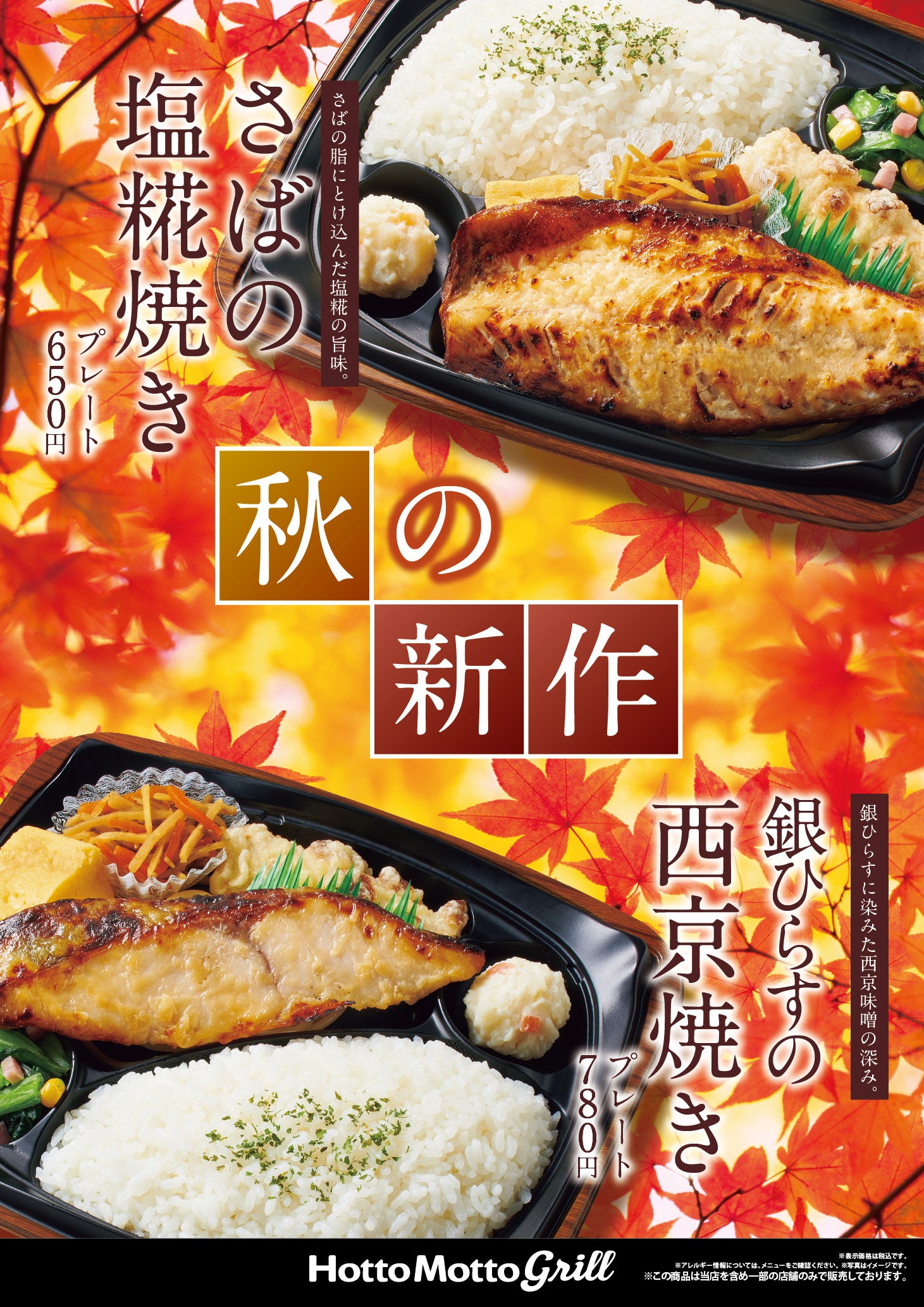 このたび「ほっともっとグリル」では、「焼き魚が味わえるメニューが欲しい」というお客様の声にお応えし、秋の新作として、脂がのったさばに塩糀を塗って焼き上げた『さばの塩糀焼きプレート』650円と、銀ひらすを西京味噌に3日間漬け込んだ『銀ひらすの西京焼きプレート』780円を9月15日(木)より新発売いたします。秋の訪れを感じるこの季節にぴったりの、味付けにこだわった本格的な焼き魚をお楽しみください。