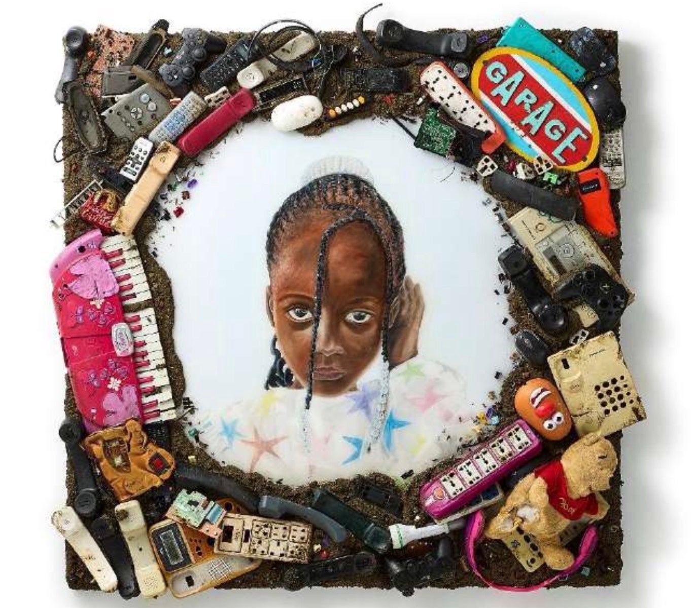 ガーナ・アグボグブロシーの大地を切り取ったかのように、キャンバスの上には電子機器散りばめられた作品です。