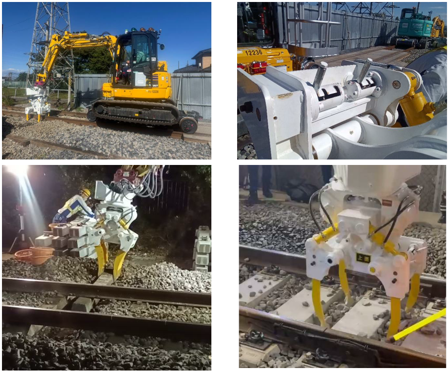 この課題を解決するために開発されたのが「G4-Ⅲ」です。「G4-Ⅲ」は、グリッパー機能と4頭タンパー両方の機能を備え、約2分という短時間で機能を切り替えることが可能です。従来必要だったアタッチメントの付け替え作業が不要となるため、作業の中断時間を大幅に削減します。さらに、360度旋回機構を搭載しており、狭隘な軌道上でもアタッチメントの向きを自在に変えることができます。特に分岐器※2の枕木交換においては、本線側からタンパーの爪を2本にすることで分岐側の突き固めが可能となり、作業効率の大幅な向上を実現しました。なお、本商品は、株式会社交通建設(本社:東京都新宿区、代表取締役社長:森 明)の協力のもと、完成しました。
