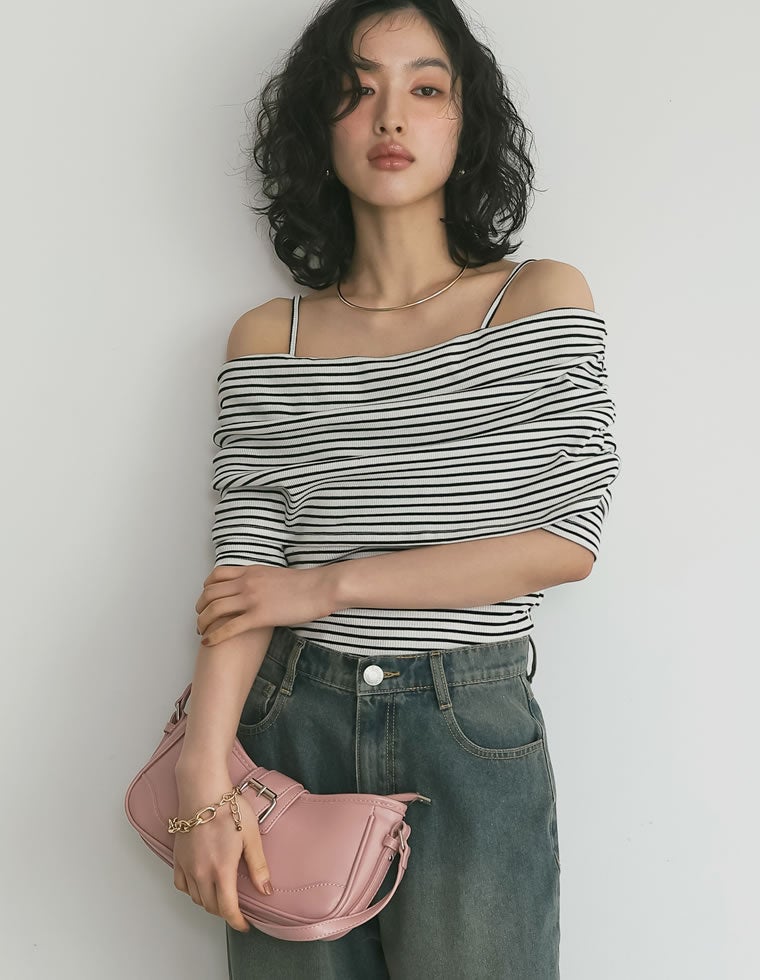 商品名:2WAYリブカットソー五分袖オフショルトップス