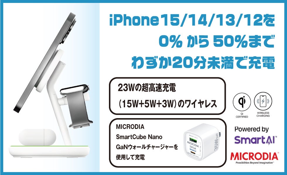 SnapStation PLUSは、iPhoneに15W、Apple Watchに3W、AirPodsに5Wの出力を提供します。iPhone 15/14/13/12をわずか20分以内で0%から50%まで充電できます。(**MICRODIA SmartCube Nano GaNウォールチャージャーを使用した場合)