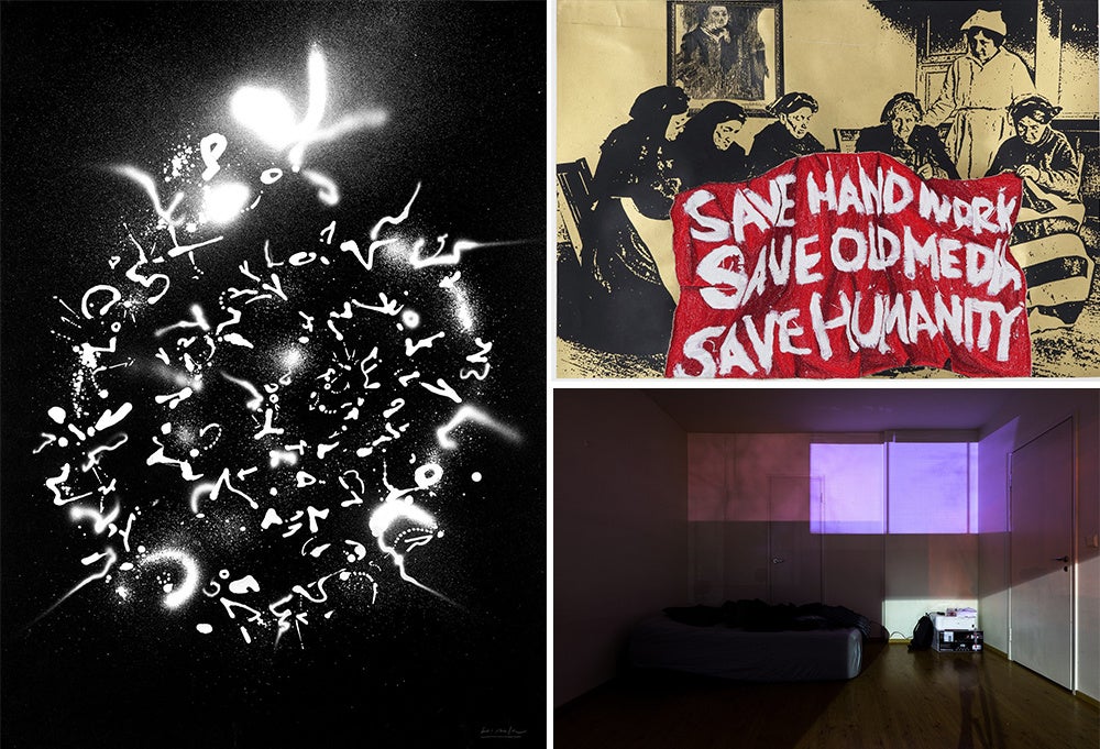 GENZO #124, 2022 ©Hiraku Suzuki, (左)、SAVE HAND WORK, SAVE OLD MEDIA, SAVE HUMANITY 2019 ©︎AOYAMA Satoru Courtesy of Mizuma Art Gallery(右上)、dislocation, 2016 ©︎Go Watanabe Courtesy of ANOMALY(右下)