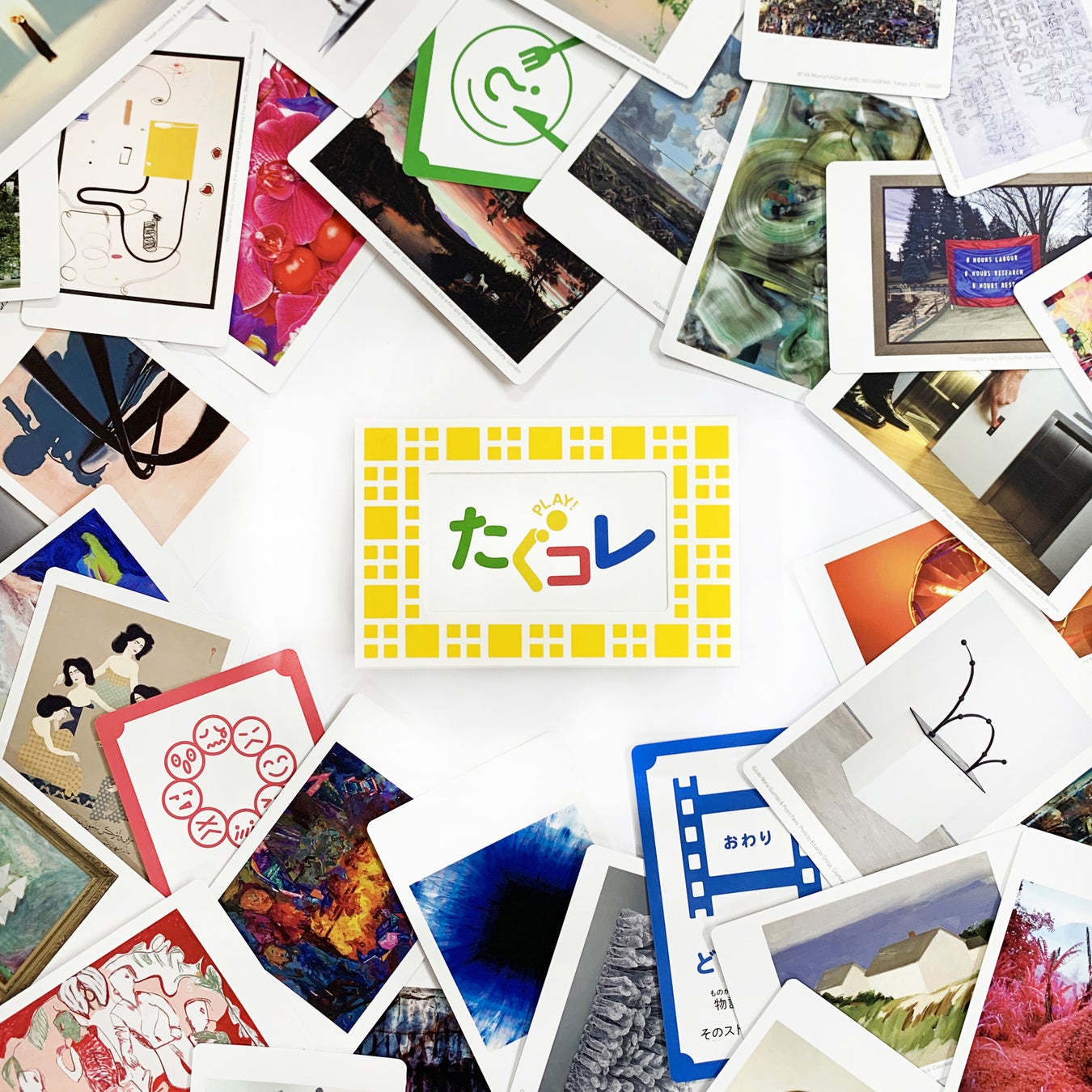 2021年には、遊びながら現代アートに親しんでもらうことを目的に、タグチアートコレクションの作品がトランプサイズになったアートカードゲーム「PLAY!たぐコレ」を刊行しました。アートカードは、カードを見ながらお気に入りの作品について会話をしたり、作品同士の共通点を探し合うなど、子どもから大人まで遊びながら気軽にアート作品に親しめることが特徴です。近年、美術館などで鑑賞教育の一つとして行われる「対話型鑑賞」の教材としても注目を集めています。「PLAY!たぐコレ」は「言葉にする力」「読み取る力」「聴く力」や「答えのない問い」に向き合い続ける姿勢を育む、現代アートの入門としても年齢を問わず楽しむことのできるオススメのグッズです。