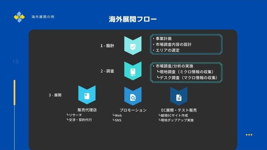 さらには市場参入後の海外プロモーションにおいても、マーケティング活動やポップアップ展開、人材確保など、現地の事情に精通した優秀な日本人スタッフによるさまざまなサポートが可能です。国内同様のタイムリーな進行を実感できます。