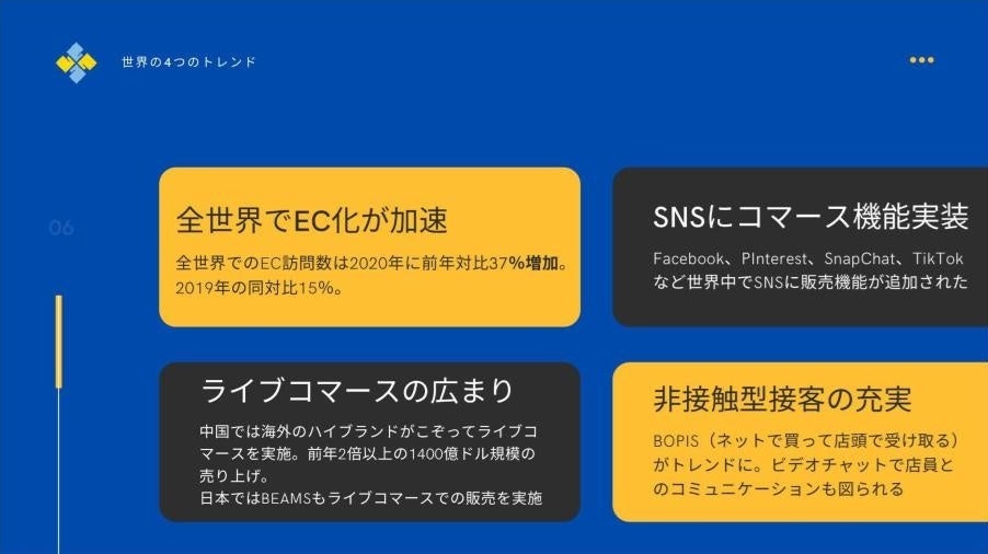 ◆「全世界でEC化が加速」「SNSにコマース機能実装」「ライブコマースの広まり」「非接触型接客の充実」という世界の4つのトレンドについて説明しました。コロナで変化した世界の動きを捉えながら、海外展開の準備をする必要があります。
