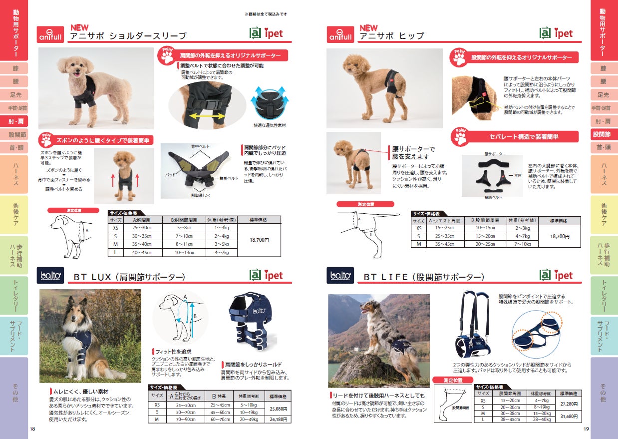 掲載製品:膝、腰、足先、手首、足首、肘、肩、股関節、首、頭、ハーネス、術後ケア、歩行補助ハーネス、トイレタリー、フード、サプリメント、スクラブなど約70製品