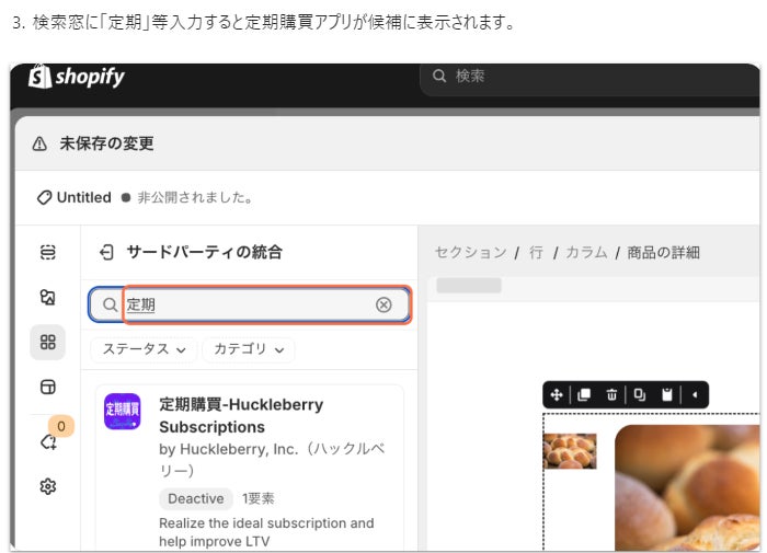 定期購買アプリをインストール、対象のテーマの定期購買アプリを有効にした後、PageFlyアプリ上でサードパーティーとして定期購買アプリが設定可能です。