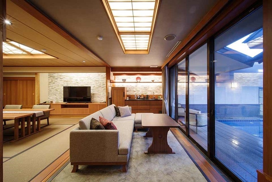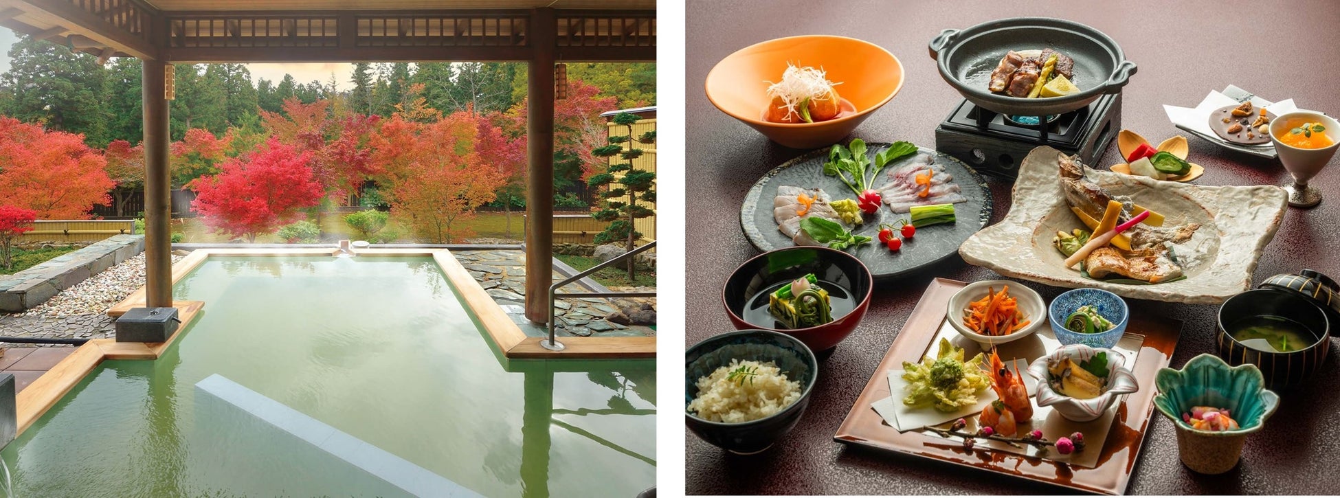 毎分480リットルが湧き出る、加水なしの源泉かけ流しの露天風呂を全室に備え、その広さは約7.3畳。お好きな時にお好きなだけ湯浴みをお楽しみいただけます。客室は和室二間とリビングを備えた105㎡のスイート仕様。そして、別棟の個室大露天風呂がお庭に広がり、プレミアムスイートには癒しのテラスや水盤もご用意しています。お食事は夕・朝ともにお部屋でいただく“上げ膳・据え膳”スタイルで、くつろぎのひとときをお届けします。温泉と美食、そして何もしない贅沢。