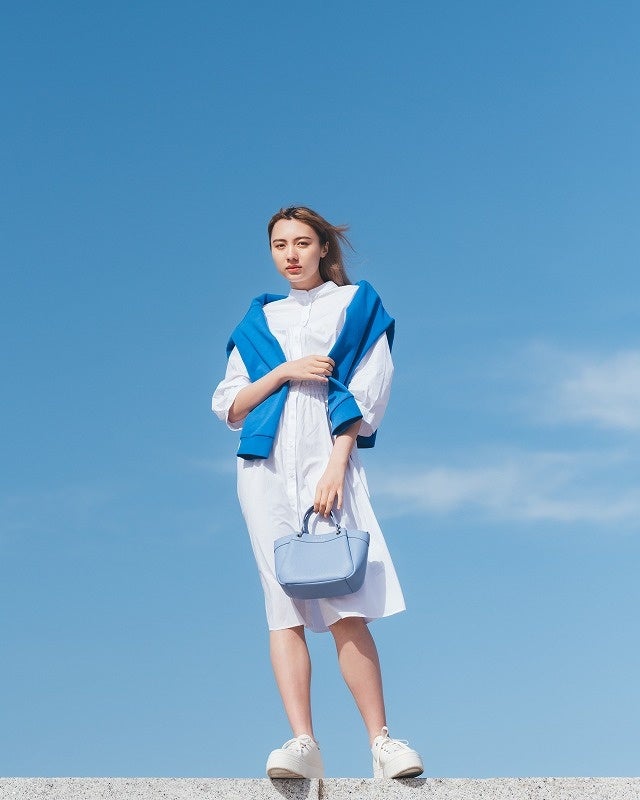 ©Eno Shohki 左 ブルーシャツドレス¥28,930 ホワイトインナータンク¥7,590 ブルーデニム¥27,060 ホワイトスニーカー¥27,830 ライトブラウンバッグ ¥23,320(全て税込み) 右 ホワイトシャツドレス ¥27,060