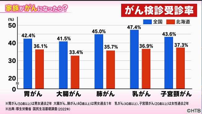 また地理的な事情から単位面積当たりの医療機関が少ないことや検診業務の人手不足も加わり、他の都府県に比べ、がん検診受診率がどの部位も大幅に低いことが知られています。例えば乳がんの場合、全国平均が47.4%のところ、北海道は36.9%にとどまり、47都道府県中、46位となっています。(厚生労働省 国民生活基礎調査 都道府県別の受診率(2022))。