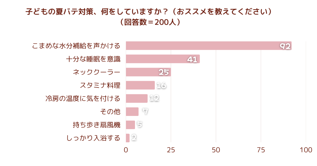 「子どもの夏バテ対策、何をしていますか?(おススメを教えてください)」とアンケート調査した結果、1位は『こまめな水分補給を声かける』でした。