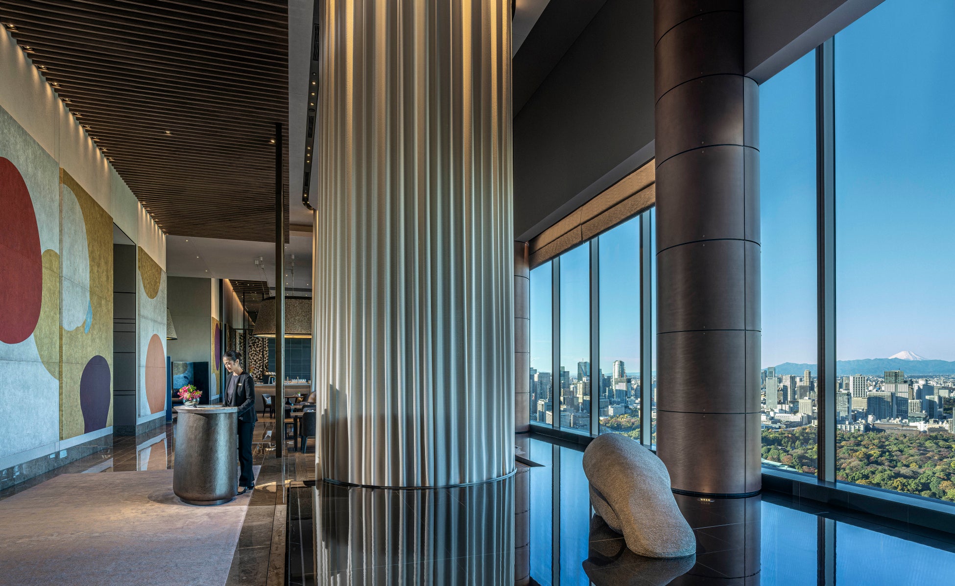 ホテル最上階の39階でエレベーターを降りると、東京のスカイラインや皇居の庭園、空気が澄む日には遠くに富士山も望めます。壁一面の大きな窓から差し込む自然光とともに、この壮大な景色は額縁に収められた美しい絵画のようです。