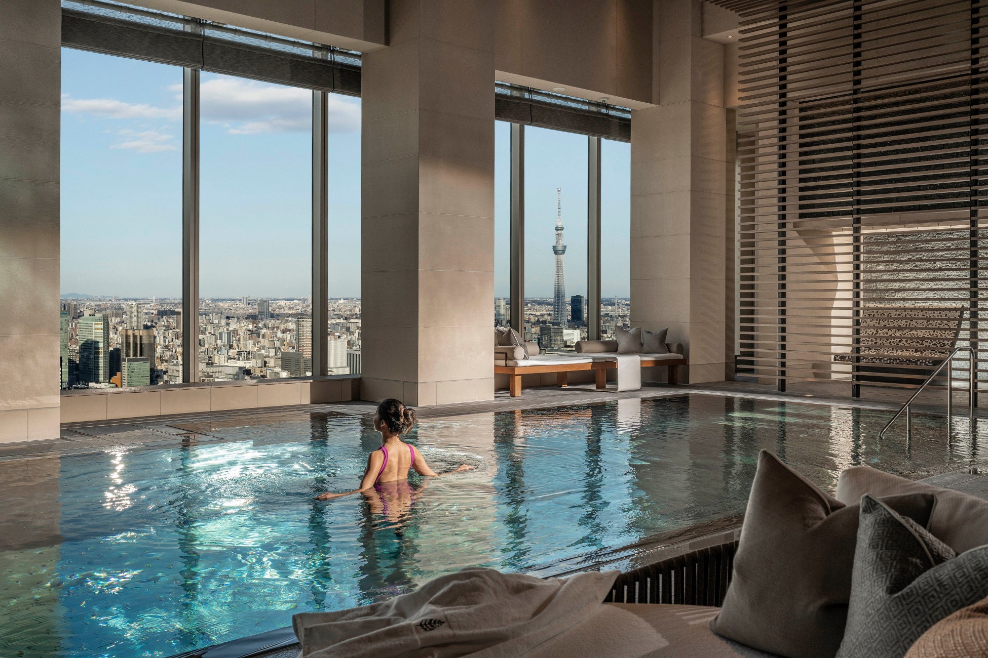 同じく39階には、ミシュラン5年連続一つ星コンテンポラリーフレンチ「est」、イタリアのアペリティーボや職人が手掛けるナポリピッツァを提供する「PIGNETO」、アジアベストバー50にて18位受賞のバーで東京とパリの融合したカクテルを振る舞う「VIRTÙ」、そして日本の四季を表現したアフタヌーンティーをご提供する「THE LOUNGE」と、4つのレストラン&バーがあります。そのほか、最先端のトリートメントを提供するトリートメントルーム、美しい東京の眺望を望むインドアプールやフィットネスジムのある天空のサンクチュアリ「THE SPA」など充実した施設が集結しています。
