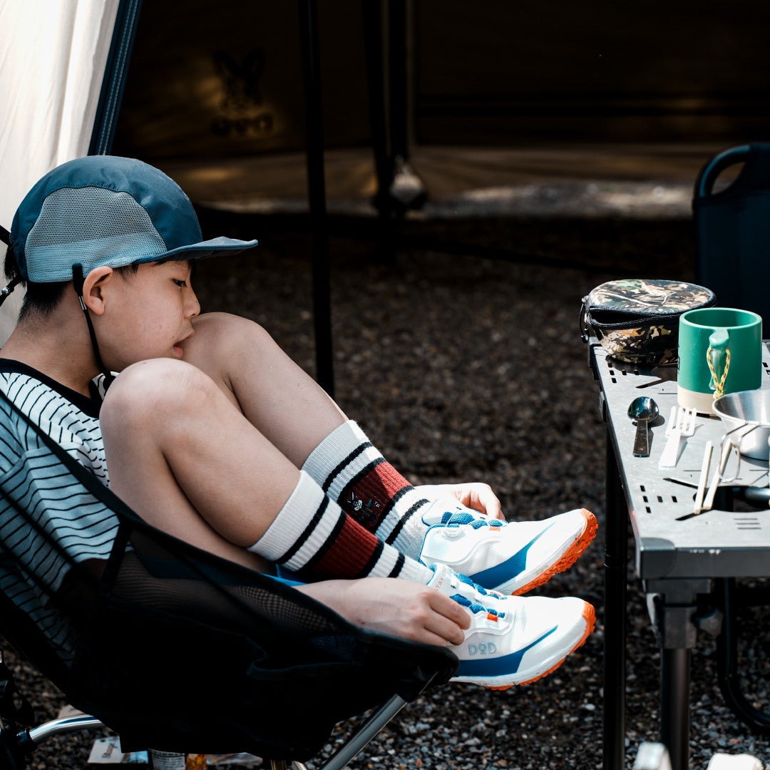 機能性シューズで定評のあるRIOの定番モデルに、DODの遊び心やキャンプのワクワクとした世界観をエッセンスとしてプラス。キャンプから日常の公園遊びまで、場所を選ばずお子さまの足元を支える『欲しかった1足』が完成しました。ベビーからジュニアまで揃う幅広いサイズ展開で、家族のアウトドアデビューを足元から全力でサポートします 。