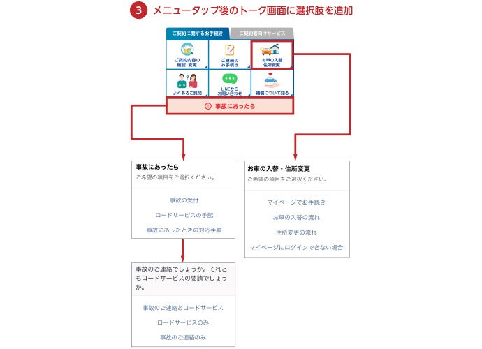 メニュータップ後のトーク画面に選択肢を追加することで、より分かりやすく、より目的に沿ったご案内を実現