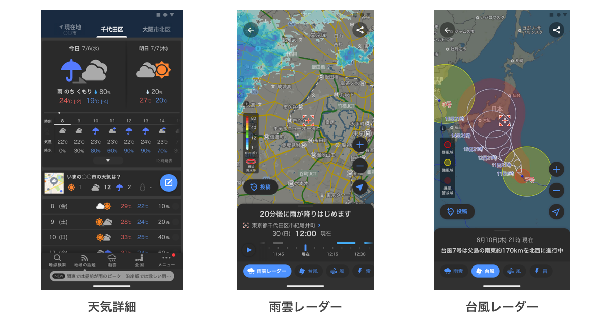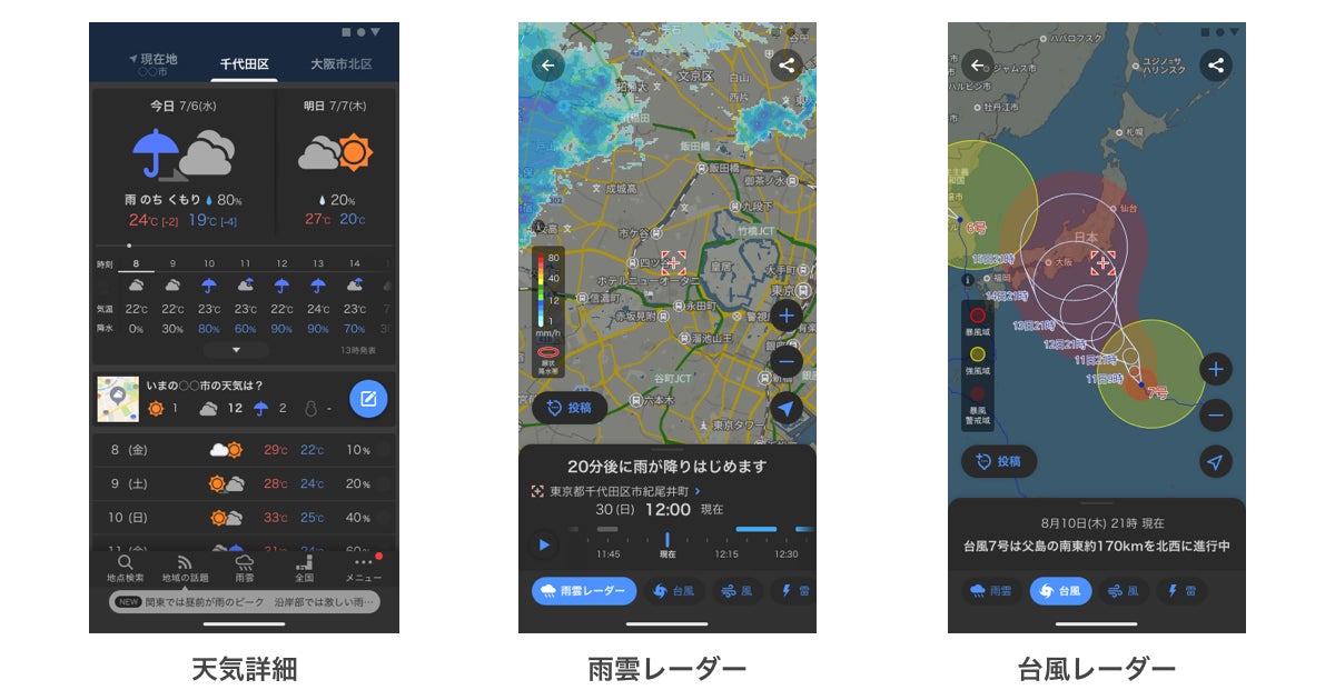 「ダークモード」は、ディスプレイの背景を、黒を基調とした暗い配色の画面に設定できる機能です(※2)。「ダークモード」に切り替えると、文字が白くなり、画像の色も映えるため、画面が見やすくなる他、夜間には光の刺激を抑えられます。「Yahoo!天気」アプリでは、地図や背景が暗くなり、イラストやアイコン、文字が強調され、「雨雲レーダー」をはじめとする各コンテンツが見やすくなります。