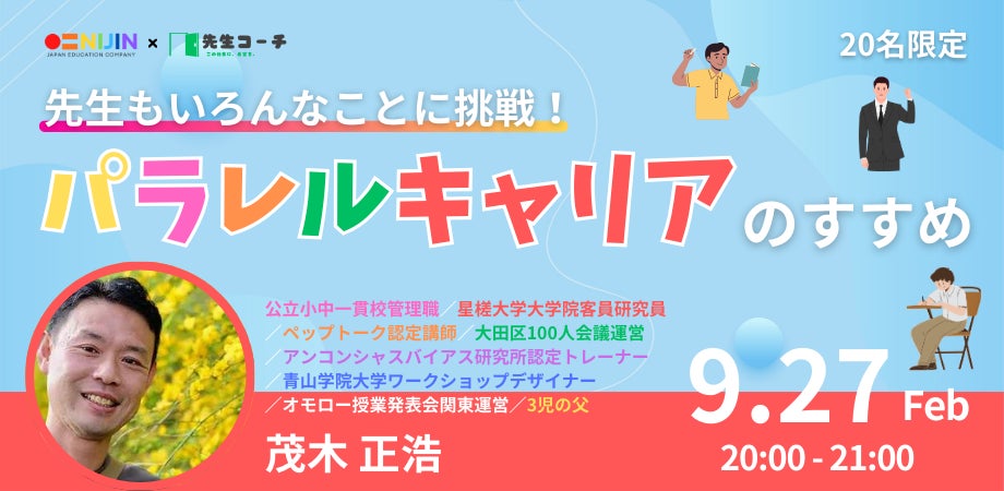 株式会社NIJIN(本社:東京都江東区、代表取締役:星野達郎)が運営する教育オンラインサロン『NIJIN教育ラボ』は、教員向け伴走型1on1コーチングサービス『先生コーチ』と共催で、オンラインセミナー「パラレルキャリアのすすめ」を2024年9月27日(金)に開催いたします。
