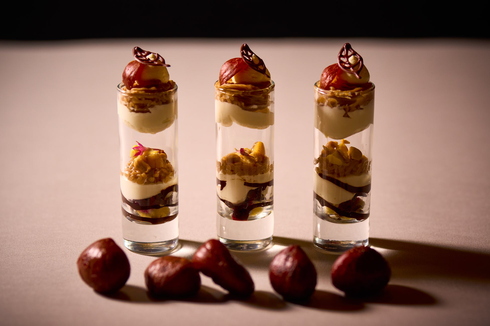 前菜として梨とブルーチーズのクレープ、肉料理として豚肉にリンゴを合わせた料理、スパイシーに仕上げたさつまいもとジャガイモのニョッキ、デザートでは食感の変化が楽しい二層のモンブランや、甘さを控えた大人向けのリンゴのタルトやパンプキンパイなど、季節の素材をフレンチの技で仕上げた料理を用意しました。