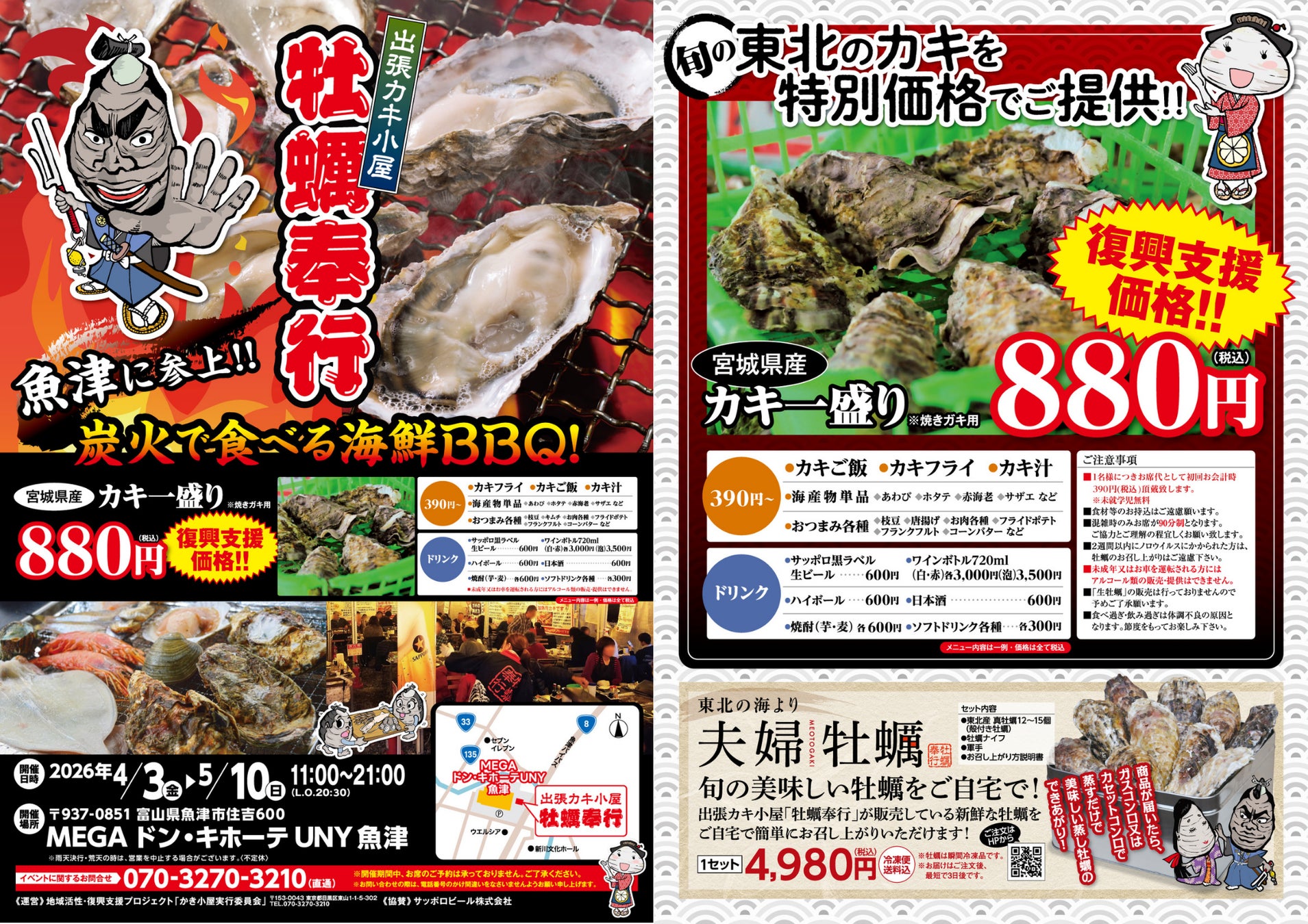 富山県魚津市に「出張カキ小屋」参上! 4月3日〜期間限定開催!《 宮城県産殻付き牡蠣が一盛り880円!! 》
