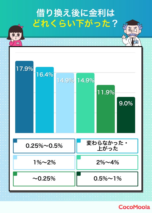 借り換え前と比べてどれくらい金利が下がったのかを調査した。「0.25%~0.5%下がった」との回答が最も多く、約18%。一方で「金利が変わらなかった・上がった」と回答した方も約16%存在した。