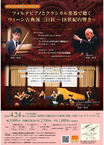 バロック音楽の巨匠ゲオルク・フィリップ・テレマンの名を冠するテレマン室内オーケストラによる演奏では、18世紀当時使われていた、鉄のフレームが入っていない素朴な音を奏でるピアノ「フォルテピアノ」や当時使用されていた「クラシカル楽器」などを使用。演目は、モーツァルト「ディヴェルティメント k.137」、ベートーヴェン「ヴィオラとチェロのための二重奏曲よりヴァイオリン・ソナタ」、ハイドン「クラヴィア・ソナタ」「ヴァイオリンとクラヴィアのための協奏曲」など、フォルテピアノと7人編成の弦楽アンサンブルが、当時のウィーンで実際に流れていた音色を高槻城公園芸術文化劇場で再現します。