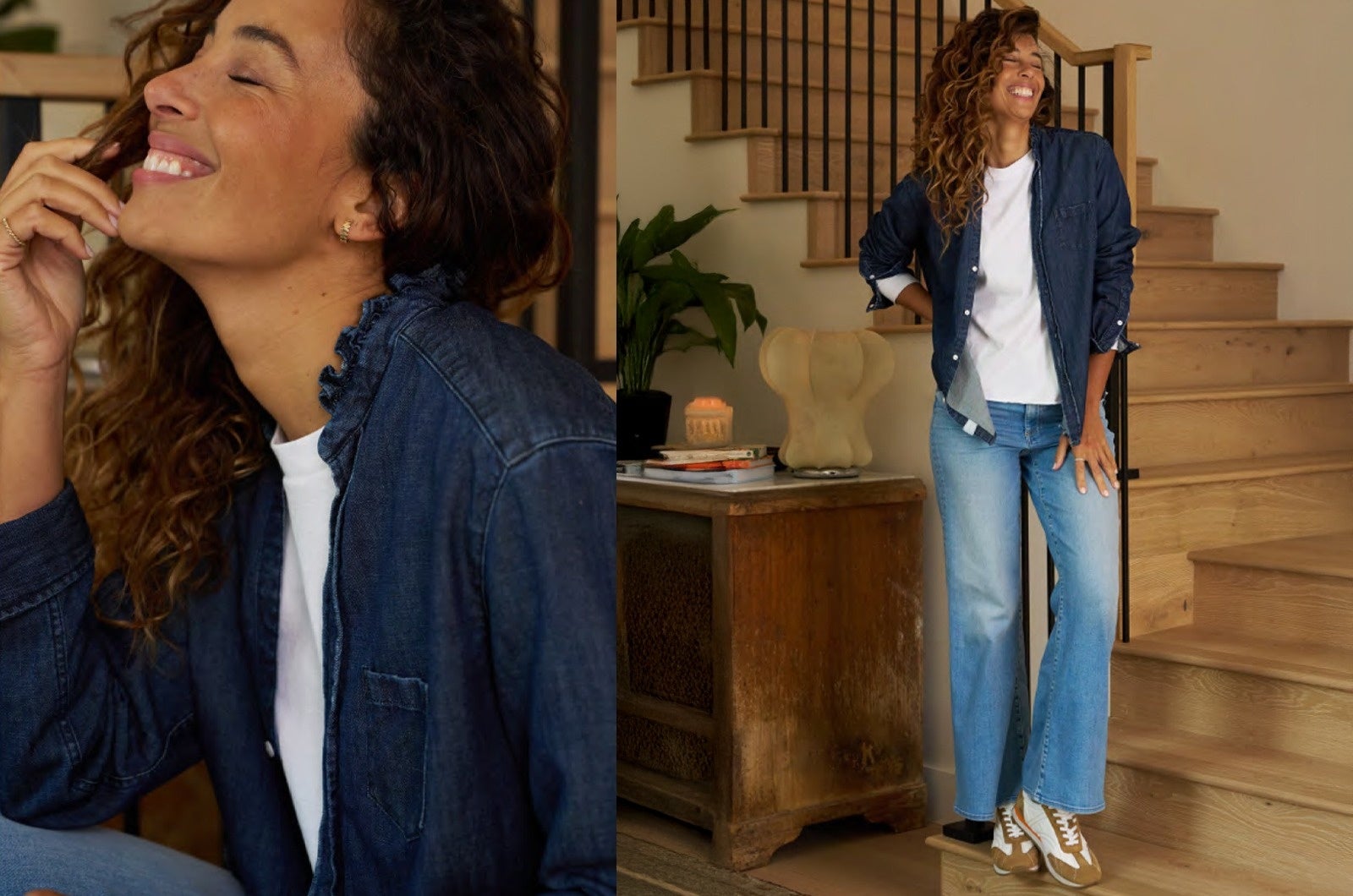Frank&Eileenのシャツ、BAREFOOT DREAMSのラウンジウェア、BLEUFORÊT のソックス、SLEEPERSのビーチサンダル、そしてMOTHERのデニム。