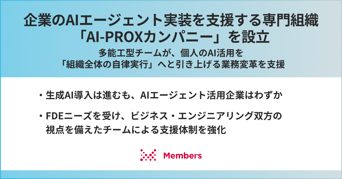 DX現場支援で顧客と共に社会変革をリードする株式会社メンバーズ(本社:東京都中央区、代表取締役社長:髙野 明彦、東証プライム:2130、以下「メンバーズ」)は、企業のAIエージェント実装を支援する専門組織「AI-PROXカンパニー(エーアイプロックスカンパニー)」を2026年4月1日付で設立したことをお知らせします。