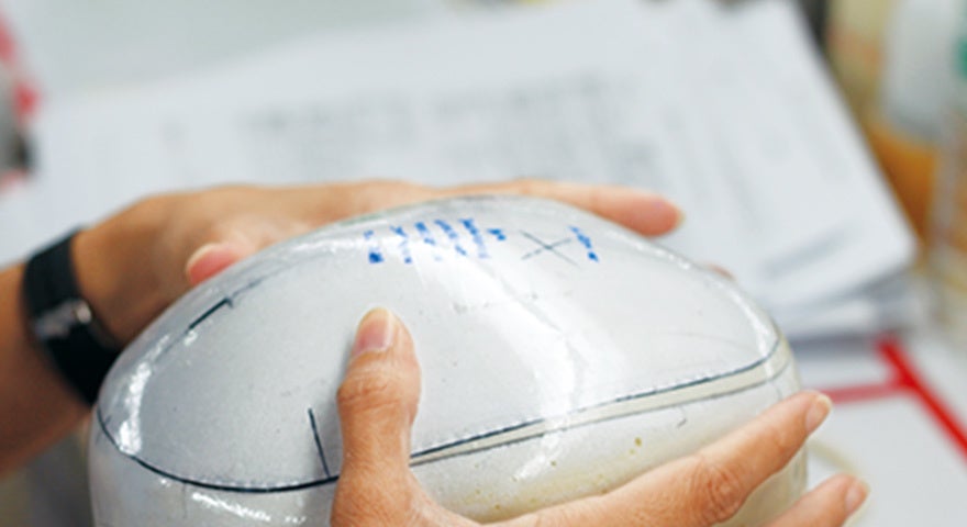 型(モールド)の形状に合わせてウィッグの土台となるベース(キャップ)を作製します。
