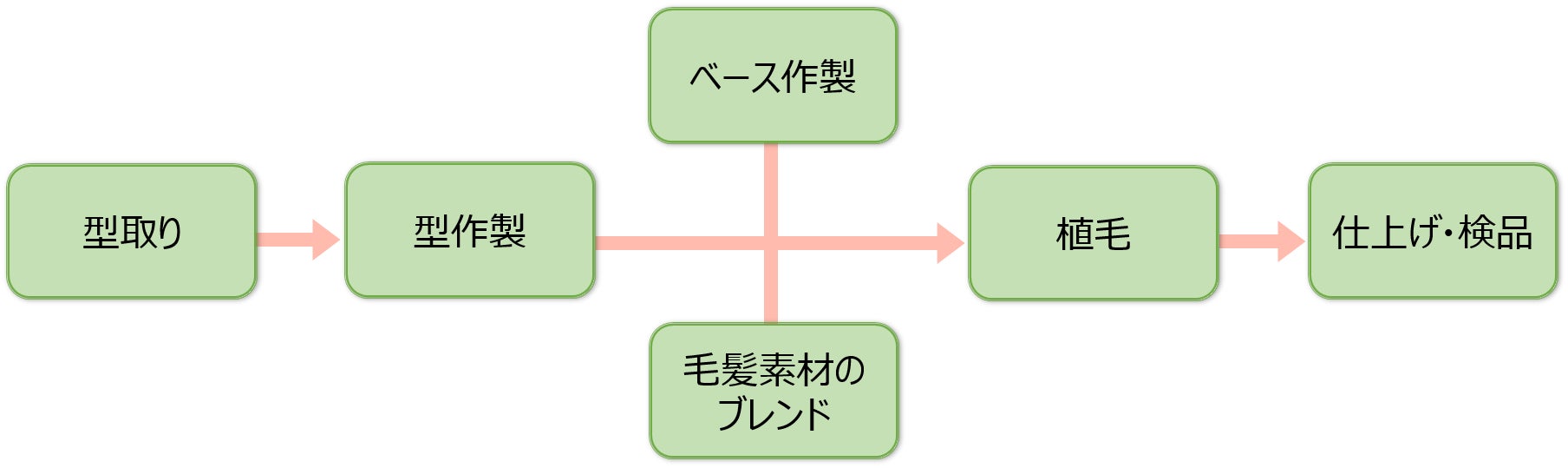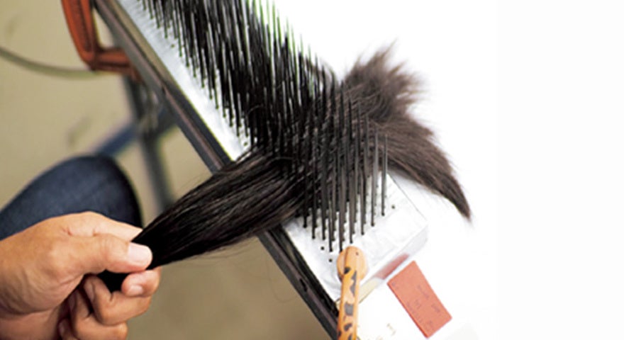 毛量、毛色、長さなど、ひとつひとつ異なる製品仕様に最もマッチする厳選された毛髪素材をブレンドします。