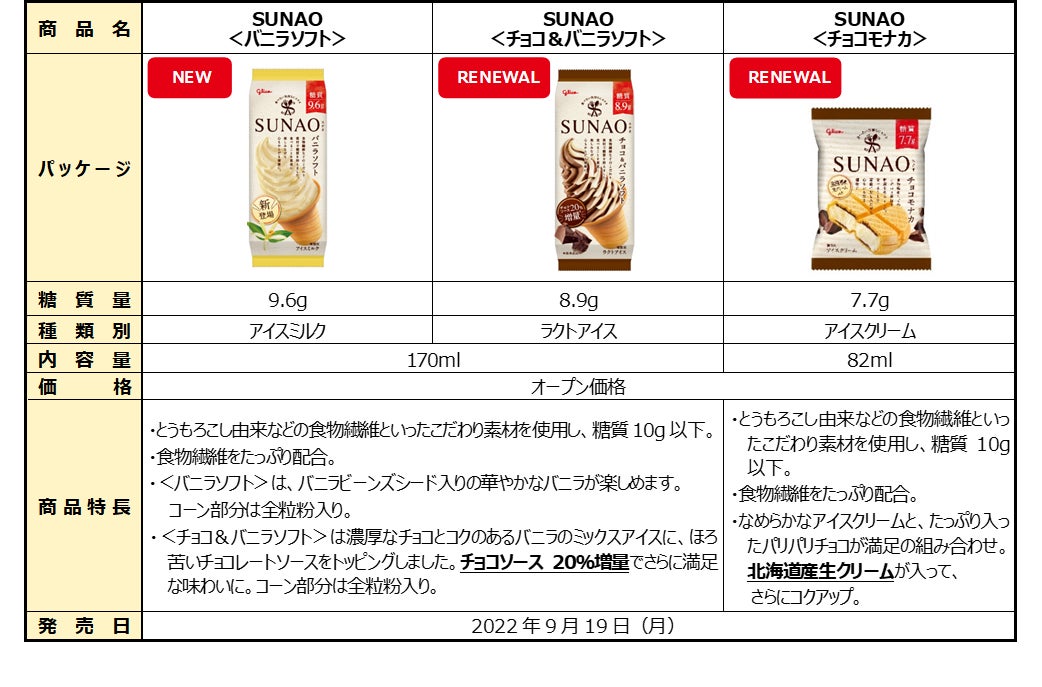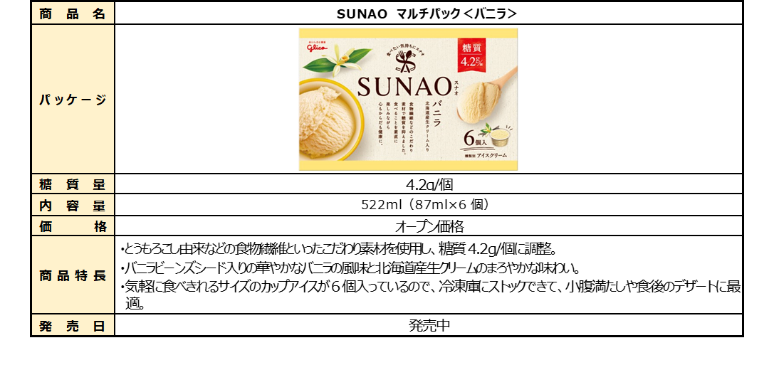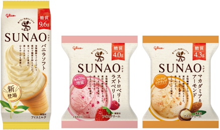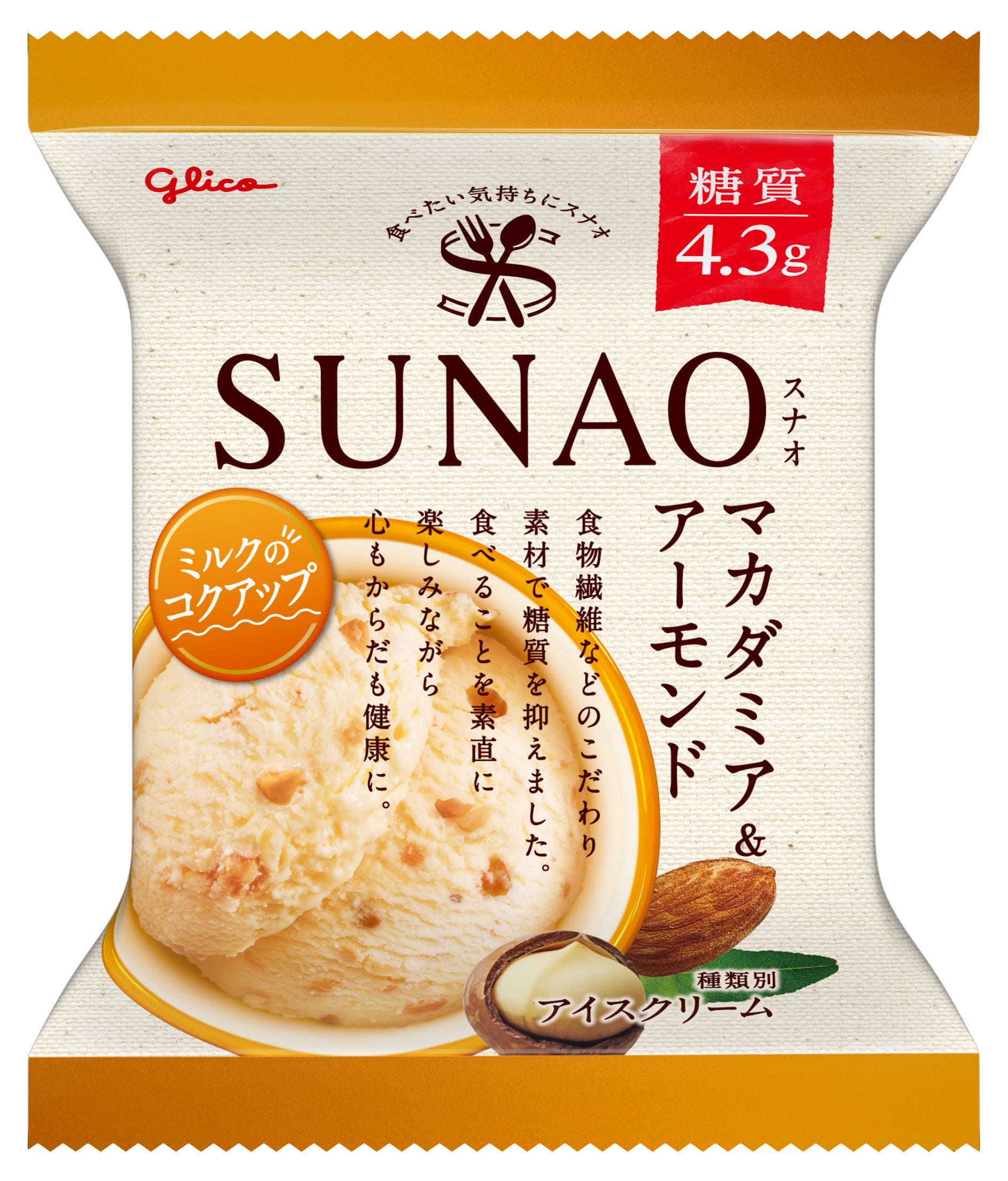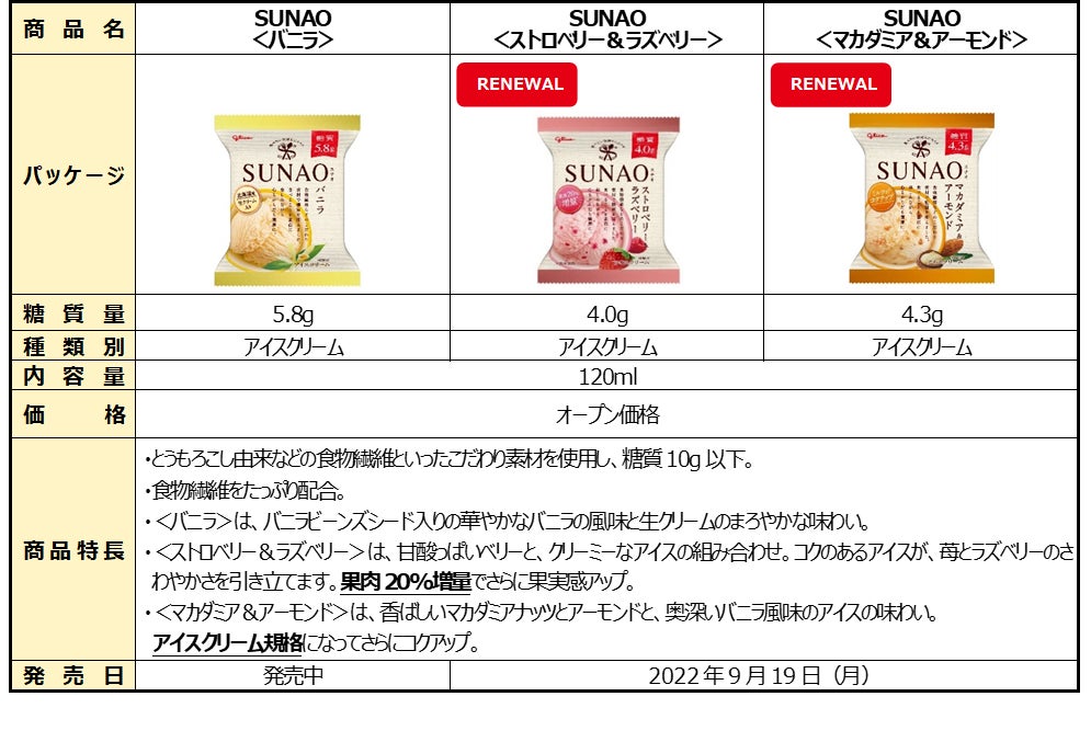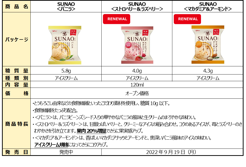 江崎グリコ株式会社は、おいしさと適正糖質※を両立するブランド「SUNAO(スナオ)」のアイスシリーズより、2年ぶりに「SUNAO<バニラソフト>」を、2022年9月19日に発売します。また、「SUNAO」カップアイスシリーズ2品(ストロベリー&ラズベリー、マカダミア&アーモンド)を、同日リニューアル発売します。従来品より糖質量を下げながら、よりコクのある濃厚なおいしさを実現しました。