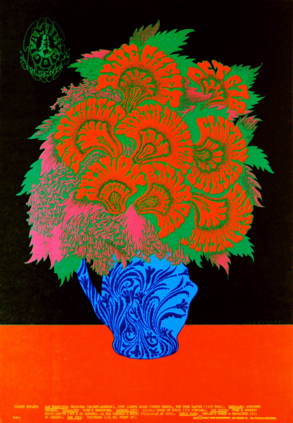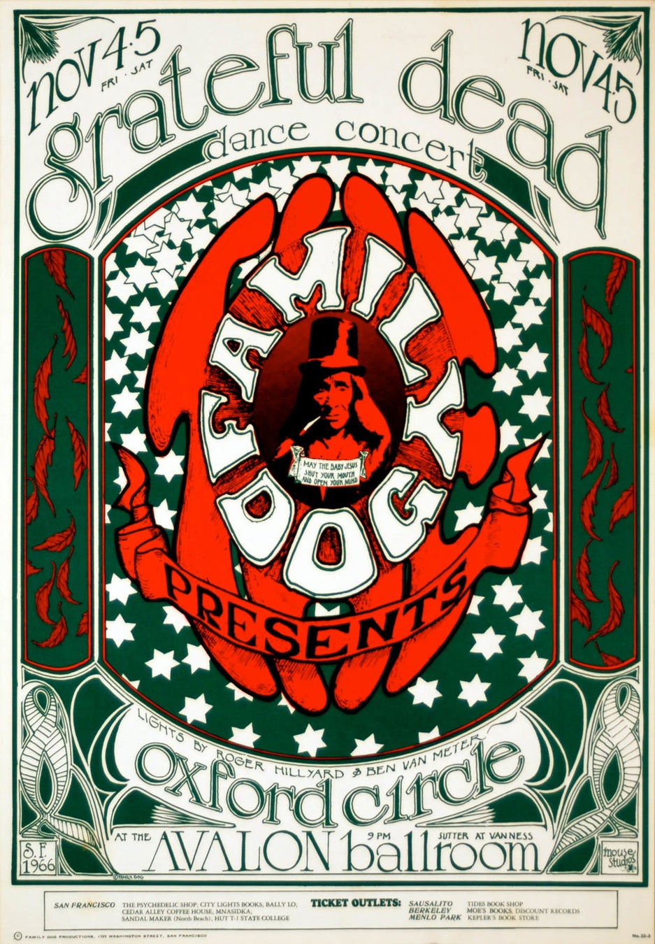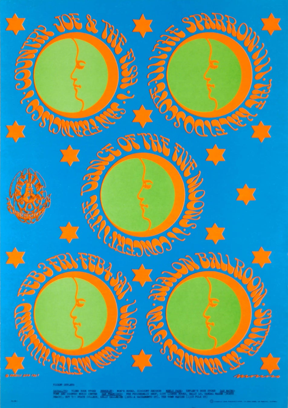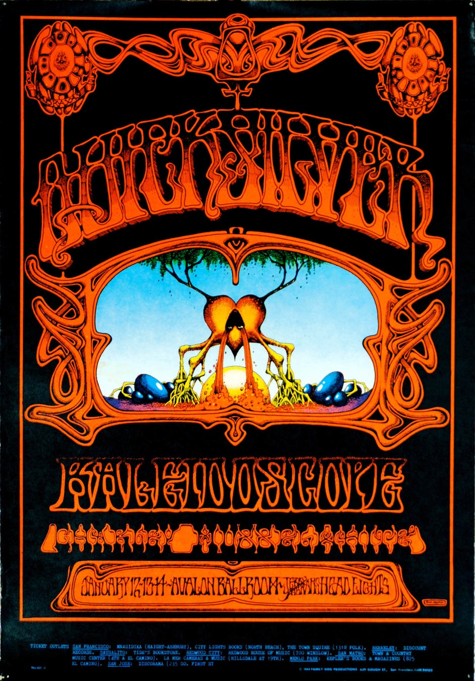 ジャニス・ジョプリンを世に送り出したチェット・ヘルムズ率いる「ファミリードッグ」が手掛けた「グレイトフル・デッド」や「ジェファーソン・エアプレイン」の初期コンサート・ポスター、ロックの殿堂フィルモアを主宰した「ビル・グラハム」シリーズを中心に、リック・グリフィンやスタンリー・マウス、ヴィクター・モスコソら「BIG5」をはじめ、アメリカ西海岸のカウンター・カルチャーを彩ったイラストレーターたちの1960年代当時のオリジナル・ヴィンテージ・ポスター43点を一挙公開。
