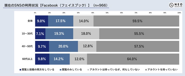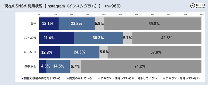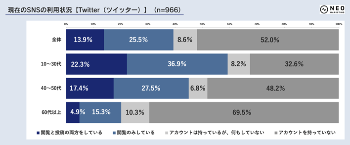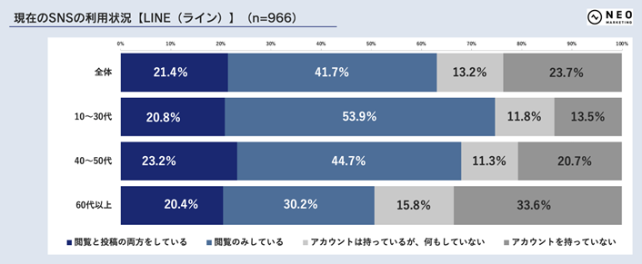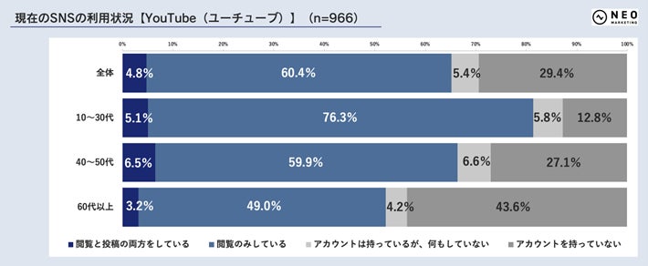 「Facebook(フェイスブック)」を除いたSNSについては、いずれも年代が高くなるにつれてアクティブさが無くなっていく傾向が見られます。特に60代以上になると、利用者は大幅に減少します。しかしそのような中でも「YouTube(ユーチューブ)」は、60代以上であっても利用者は半数を超えており、またどの年代の利用者においても“閲覧ユーザー”がそのほとんどを占める、という点が特徴的でした。