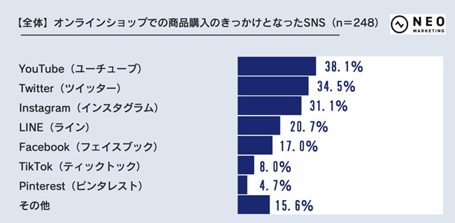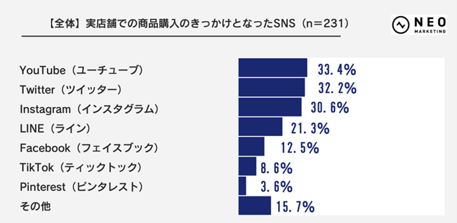 結果を見ると、購入に至った先がオンラインショップか実店舗かにかかわらず「YouTube(ユーチューブ)」がトップとなり、そこに「Twitter(ツイッター)」、「Instagram(インスタグラム)」と続いています。