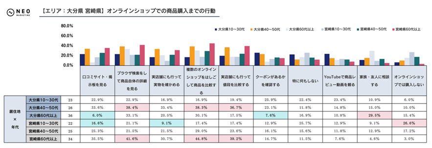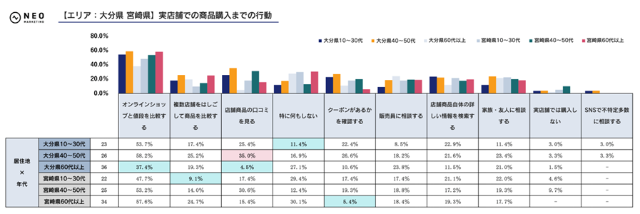 また、40~50代における「複数のオンラインショップをはしごして商品を比較する」「実店舗にも行って値段を比較する」では、全体がそれぞれ25.2%、24.3%に対して、大分県40~50代は38.3%、36.7%と12~13%近く上回りました。