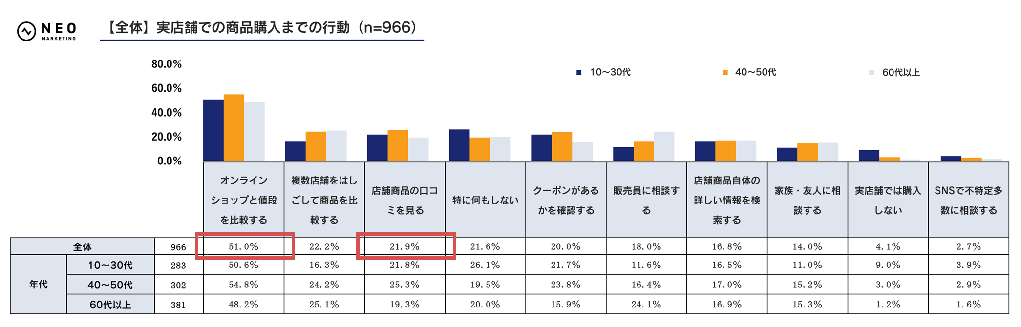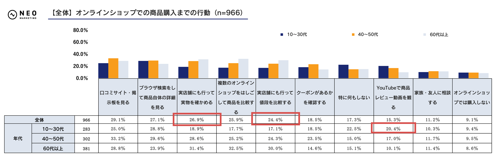 また、全体の結果を見ると、「販売員に相談する」といった実店舗ならではの行動の割合よりも、「店舗商品の口コミを見る」割合の方が多い点にも注目です。店舗内で得られる情報よりも、インターネット上で得られる客観的な情報をより重要視していることがわかります。