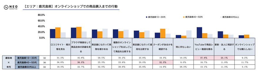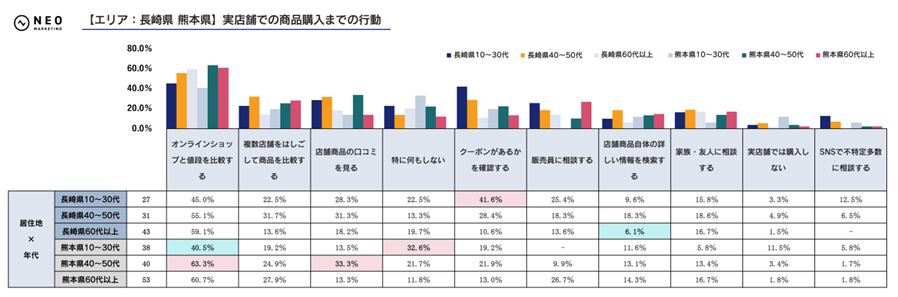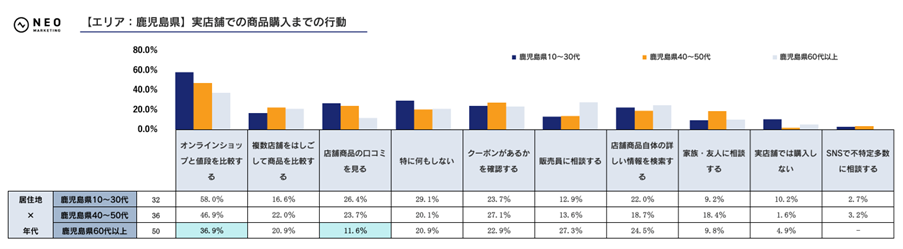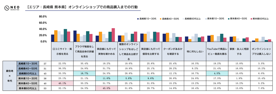 また、「実店舗にも言って実物を確かめる」では、全体60代以上が31.4%に対して、熊本県60代以上は43.0%と12ポイント近く上回る結果となりました。
