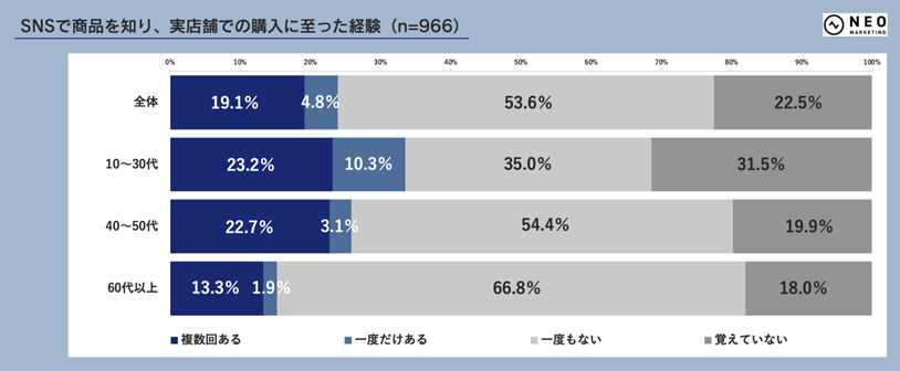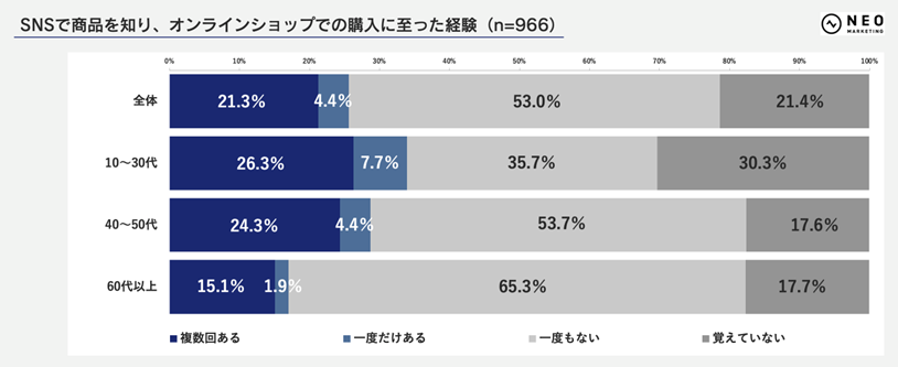 結果を見ると、購入に至った先がオンラインショップか実店舗かによる違いはあまりなく、いずれにしても「SNSをきっかけとする商品購入経験」割合は約20%となりました。