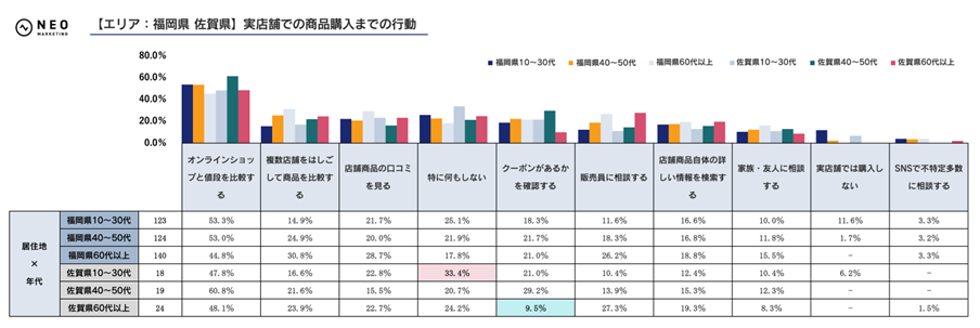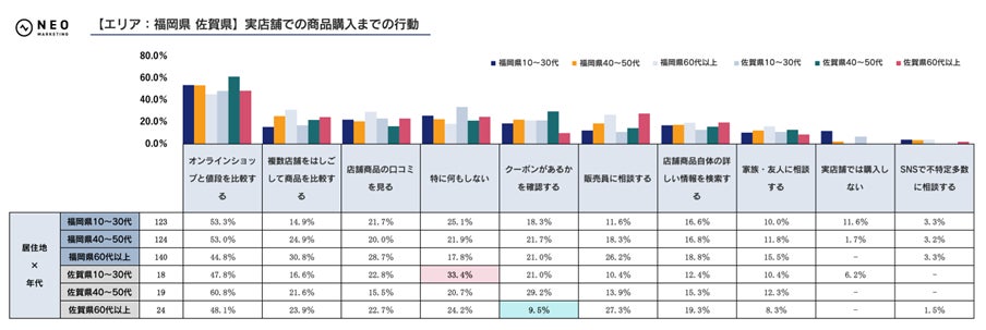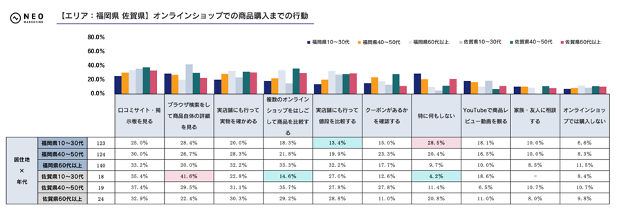 九州全体と都道府県別で比較すると、「ブラウザ検索をして商品自体の詳細を見る」では、全体10~30代が27.1%に対し、佐賀県10~30代は41.6%と13ポイント近く上回りました。