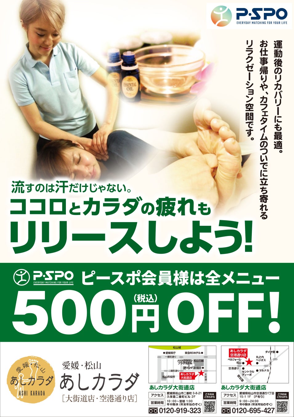 ・P・SPO会員様は、あしカラダの全メニューが500円OFFで受けられます。