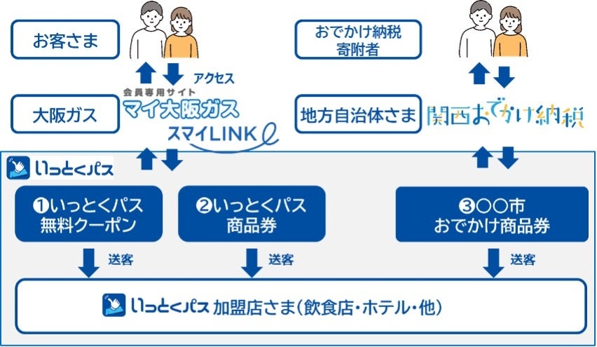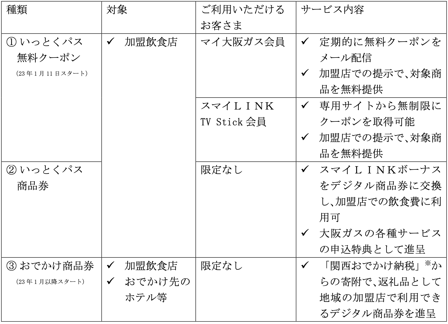 大阪ガス株式会社(代表取締役社長 藤原 正隆、以下「大阪ガス」)と株式会社ギフティ(代表取締役 太田 睦、鈴木 達哉、以下「ギフティ」)は、関西圏の飲食店を中心とする地域店舗のネットワークをデジタル化し地域経済の活性化に貢献するために2022年10月1日に業務提携契約を締結し、家庭用のお客さまと飲食店をつなぐ新たなデジタルチケットサービス「いっとくパス」を12月5日からスタートします。当サービスは大阪ガスの会員制サイト「マイ大阪ガス」や「スマイLINK」の会員に、無料クーポンの配布やポイントによるデジタル商品券への交換などを通じて、加盟店でお得に飲食できるサービスです。また、今後は、本デジタルインフラを活用し、現地消費型のふるさと納税である「関西おでかけ納税」およびその返礼品として地域の飲食店で利用できる電子商品券「おでかけ商品券」を自治体に対して提供することも予定しています。