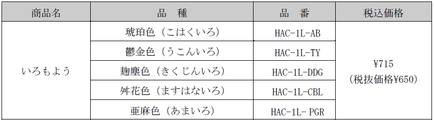 この度発売する新色は、日本の多彩な伝統色から、近年好まれている「くすみカラー」を選定。ラインナップは「琥珀色(こはくいろ)」「鬱金色(うこんいろ)」「麹塵色(きくじんいろ)」「舛花色(ますはないろ)」「亜麻色(あまいろ)」の5色です。