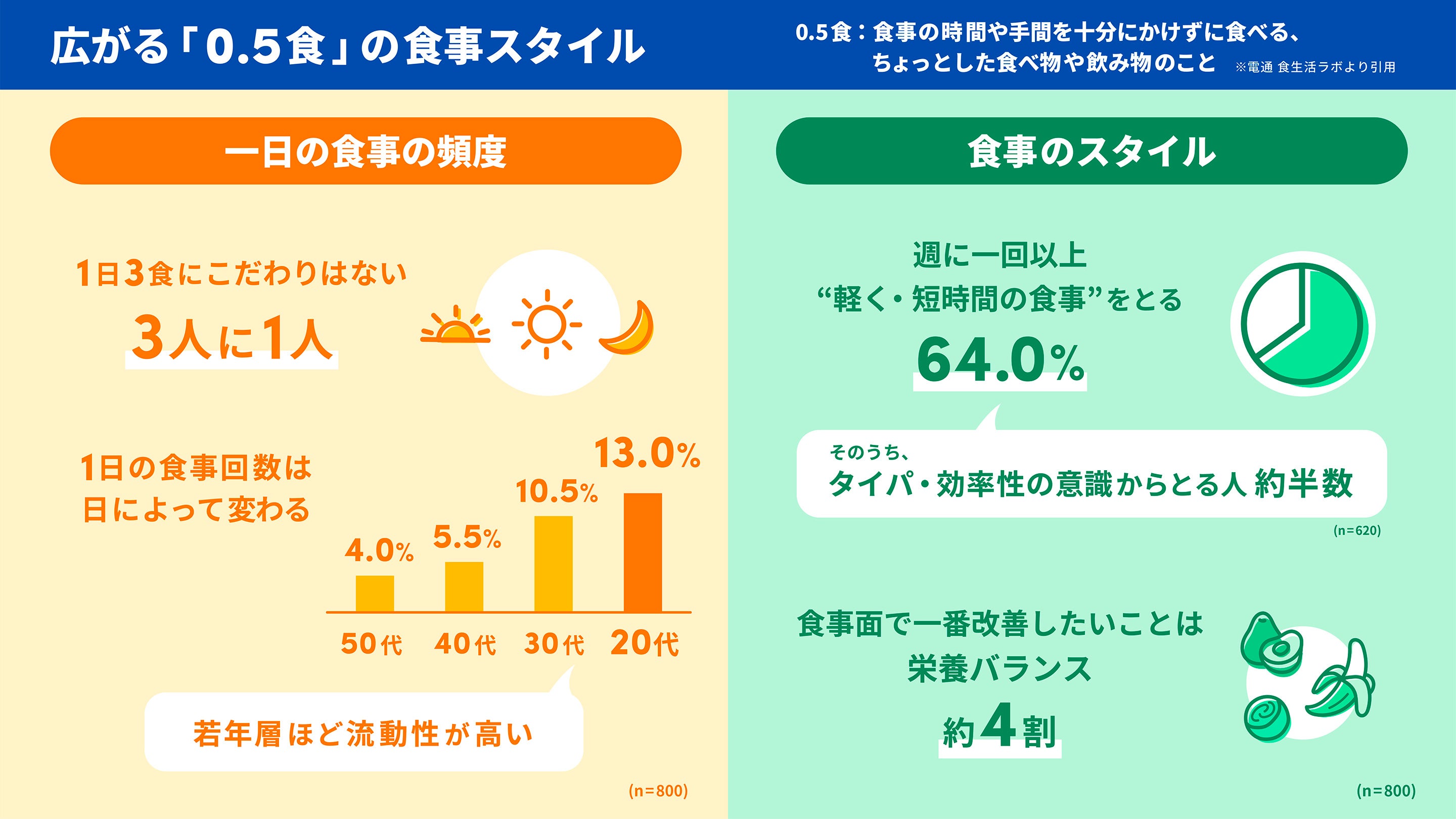 ※1)参照:電通 食生活ラボ「1日3食は、もはや当たり前ではない?時代を象徴する『0.5食』」https://dentsu-ho.com/articles/8662