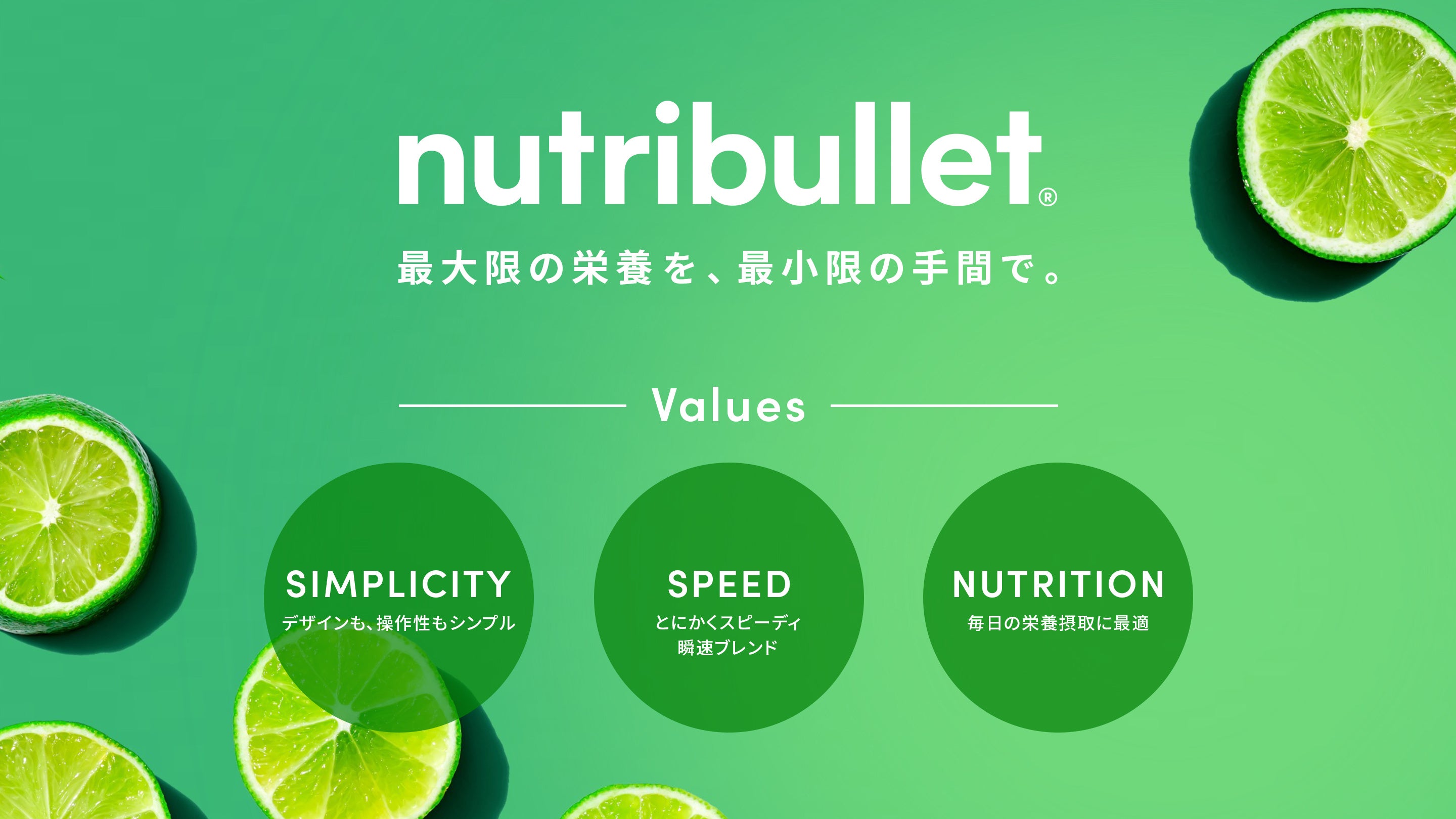 米国カリフォルニアで誕生した「nutribullet®」は、世界中の人々が栄養摂取をシンプル、簡単、そして効果的にすることをミッションとしています。ブランド名は、「Nutrition(栄養)」と「Bullet(弾丸)」を掛け合わせており、『栄養を瞬時に、スピーディーに』お届けしたいという意味を込めています。ブランドのすべての製品に共通する特徴として、「最小限の手間で、最大限の栄養」をテーマに掲げ、ユーザーが心身ともに健康で豊かな毎日を送れるようサポートしたいという想いを込めています。