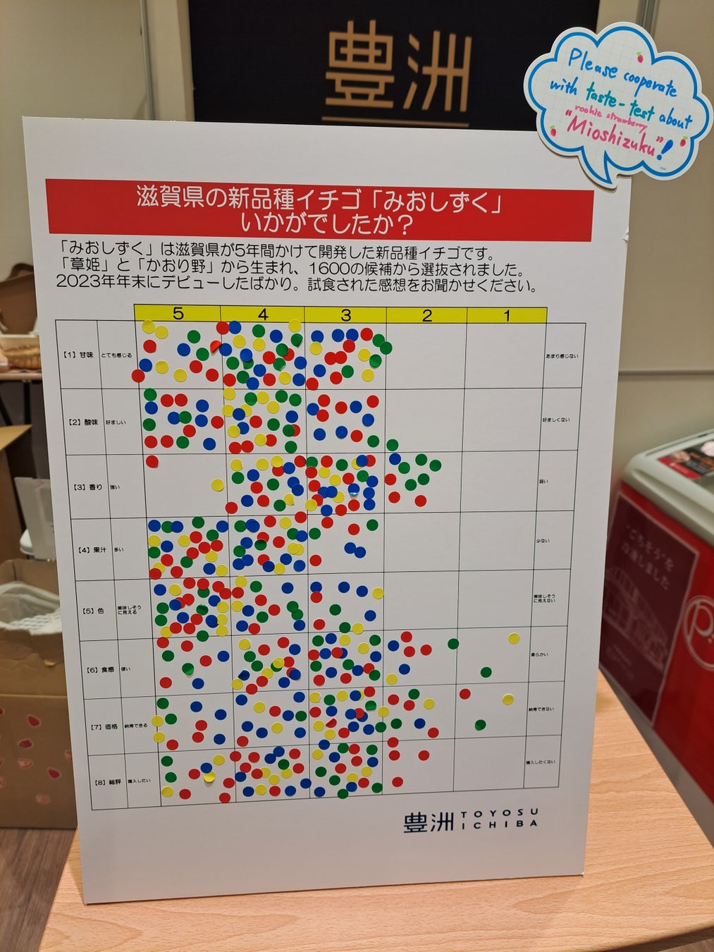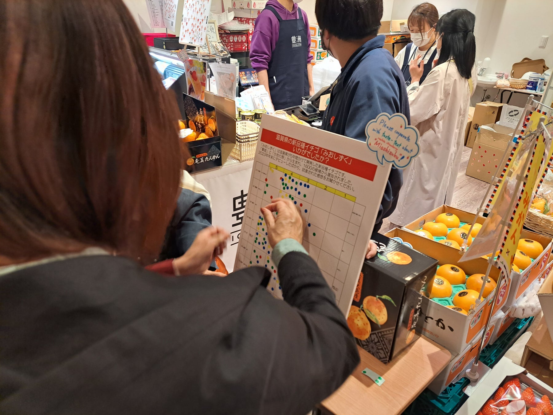 2024年3月15日金曜日に「豊洲千客万来」内の『豊洲市場ドットコム』直営店にて、「JA全農しが」との協働で、新品種のイチゴ「みおしずく」の試食会とアンケート調査を実施しました。