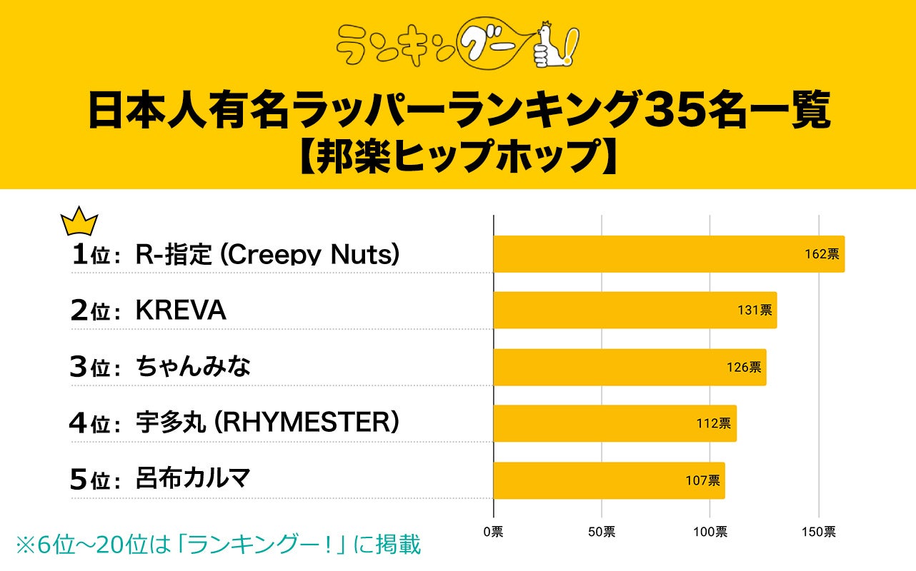 2位は日本のHIPHOPシーンを牽引する人気ラッパー、KREVAさん。2位と5票差で3位には同世代を虜にする女性ラッパー、ちゃんみなさんがランクイン。続く4位はHIPHOPグループ「RHYMESTER(ライムスター)」の宇多丸さん。4位とまたもや5票差で5位にランクインしたのは、ACジャパンのCMでも注目を集めた呂布カルマさんでした。