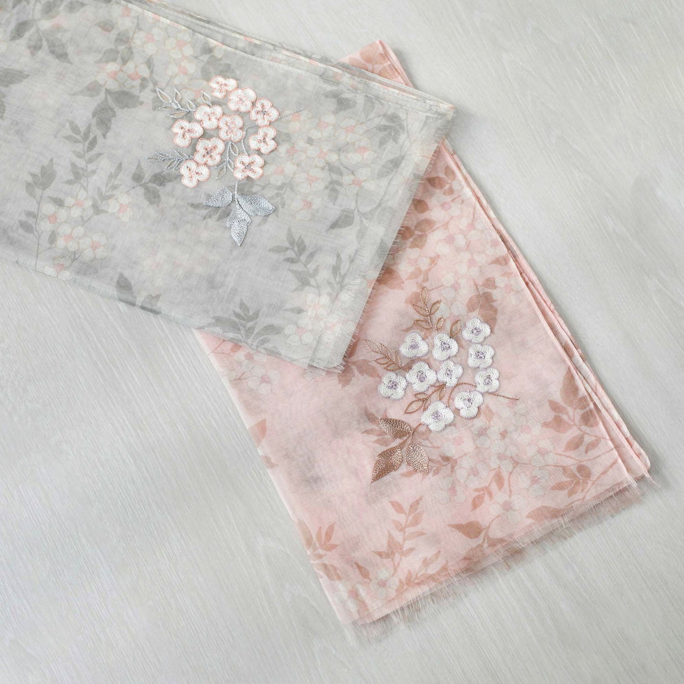 ストールの両裾にはプリントと同じフラワーモチーフをハンドル刺繍し、華やかさをプラスしています。