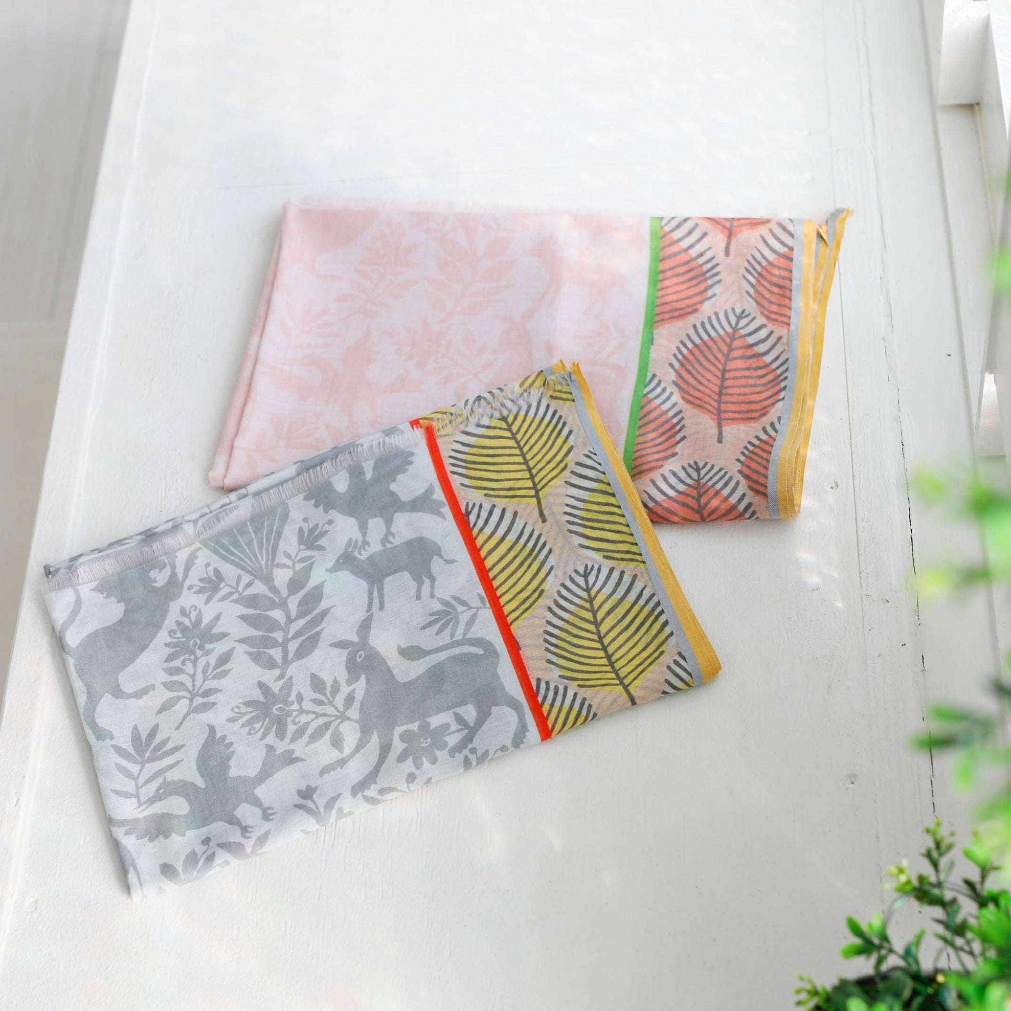 コットンシルクのさらりとした風合いの生地に、動物のシルエットをエスニック風にデザインしたストール。