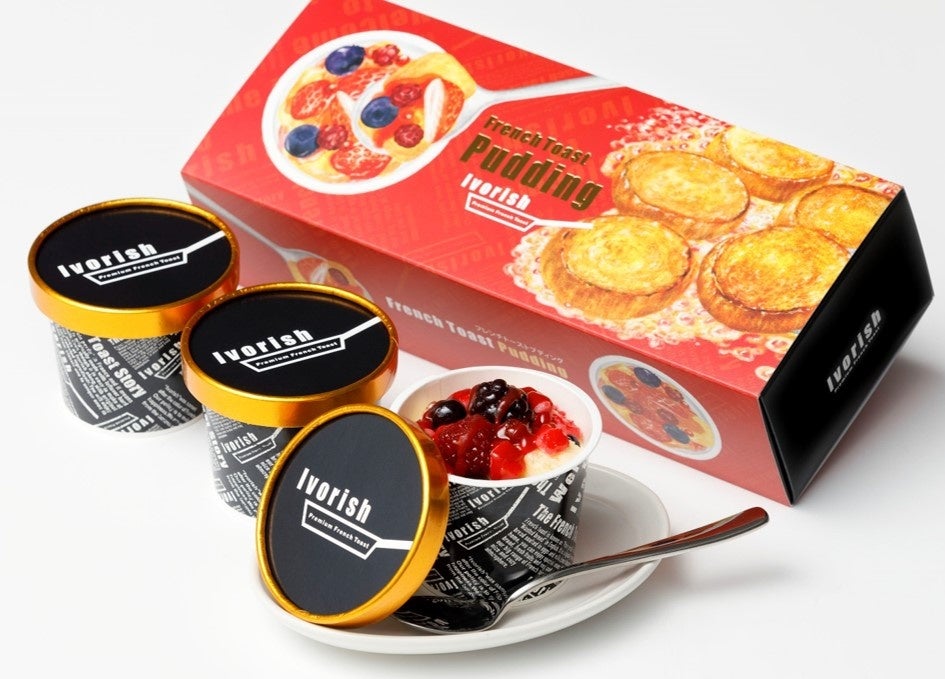 フレンチトースト専門店Ivorishカフェの人気メニュー「パンプディング」をご家庭でお楽しみいただけるように再構築した人気商品。3個入り1,620円(税込)
