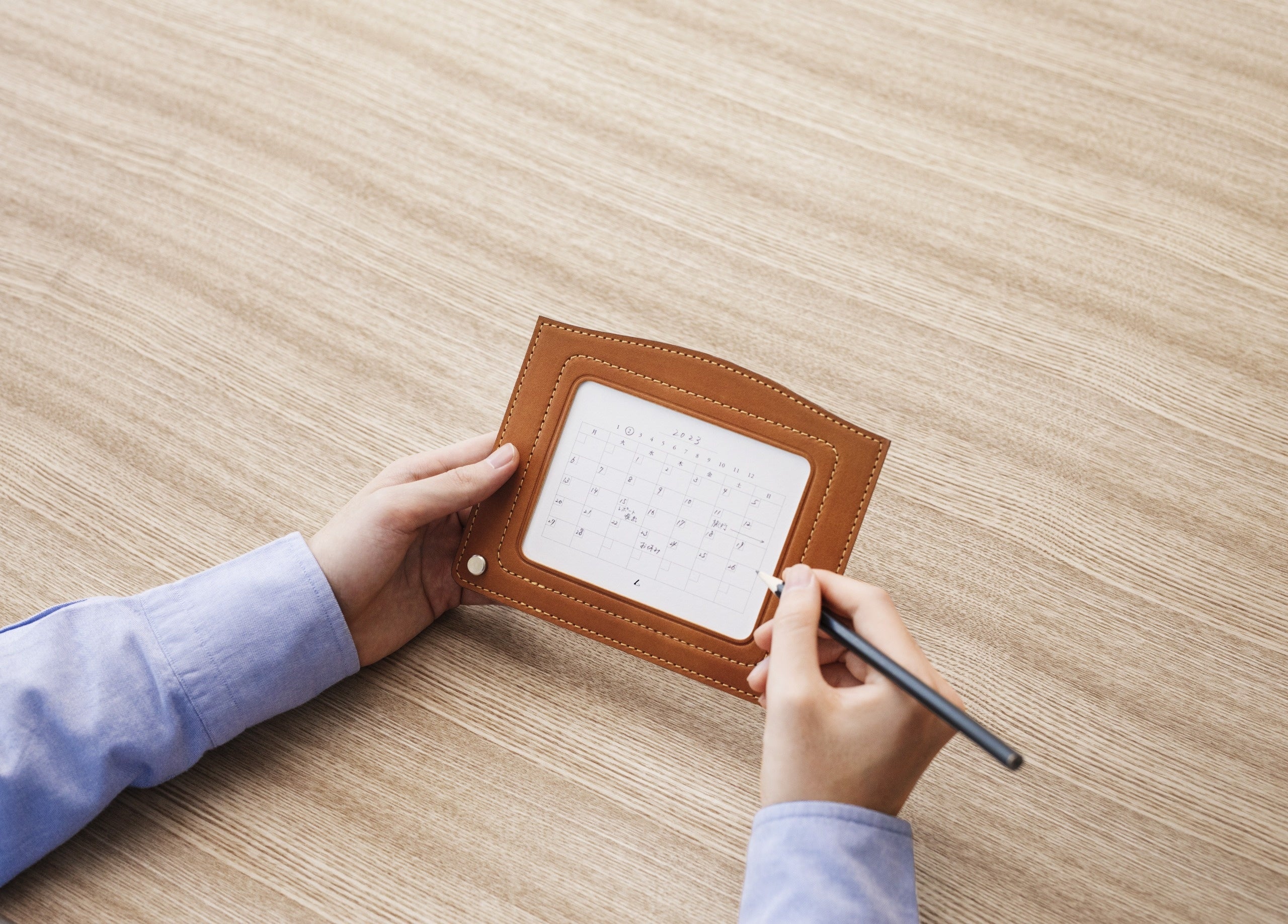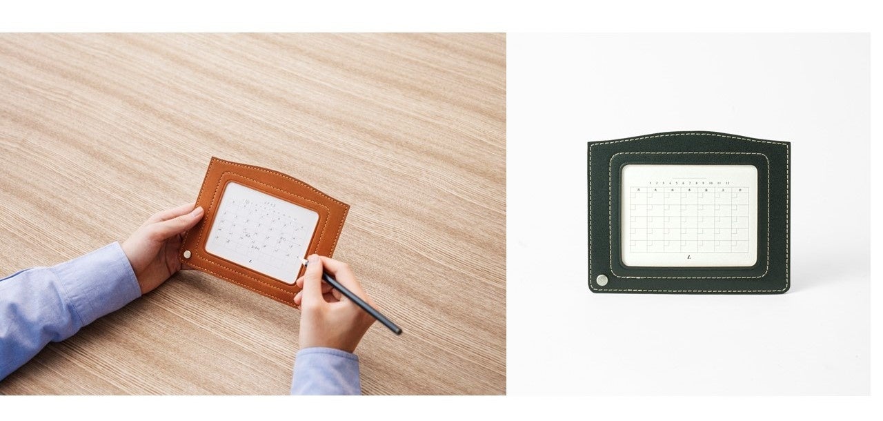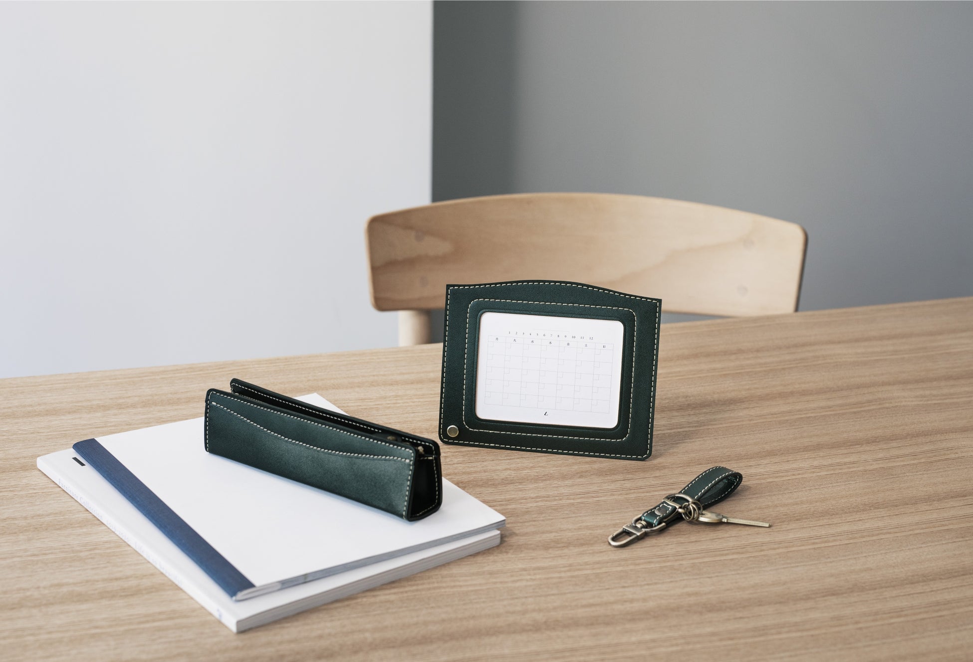 ランドセル前段(名刺ポケット部分)を使って生まれたカレンダーです。ゆるやかな曲線が温かみを表現し、シンプルでデスクに馴染むデザインに仕上げました。