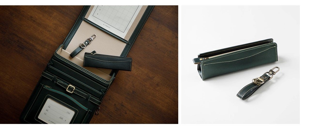 1つのランドセルから作られるペンケースとキーチャームのセットです。ペンケースは口が大きく開き、出し入れがスムーズ。キーチャームはランドセルの前段についていた前ベルトの部分を使用しています。